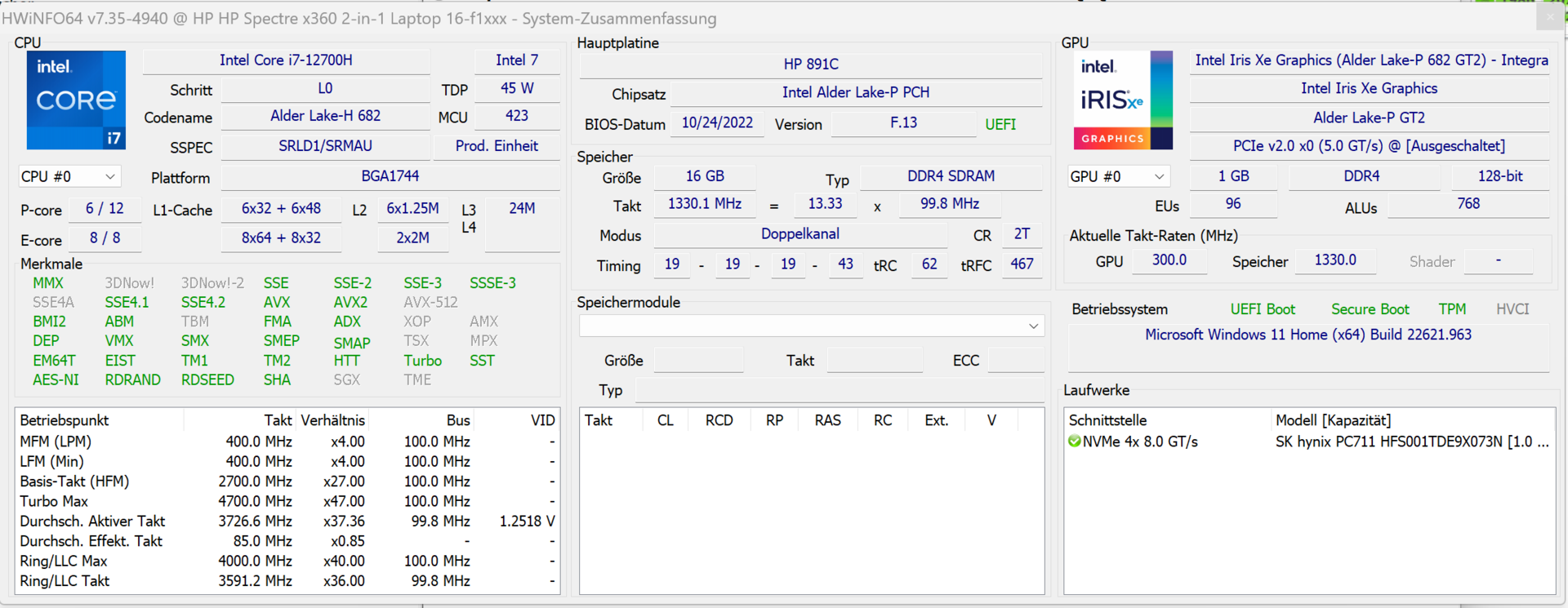 | HP Spectre x360 2-in-1 16-f1075ng i7-12700H, Iris Xe G7 96EUs, SK Hynix PC711 1TB HFS001TDE9X073N, IPS, 3072x1920, 16" | MSI Summit E16 Flip A12UDT-031 i7-1280P, GeForce RTX 3050 Ti Laptop GPU, Samsung PM9A1 MZVL22T0HBLB, IPS, 2560x1600, 16" | Lenovo Yoga 7 16IAP7 i7-1260P, Iris Xe G7 96EUs, Micron 2450 512GB MTFDKCD512TFK, IPS, 2560x1600, 16" | Dell Inspiron 16 7620 2-in-1 i7-1260P, Iris Xe G7 96EUs, Toshiba KBG40ZNS512G NVMe, IPS, 1920x1200, 16" | LG Gram 16 2-in-1 16T90P i7-1165G7, Iris Xe G7 96EUs, SK Hynix PC401 512GB M.2 (HFS512GD9TNG), IPS, 2560x1600, 16" | Medio Intel Iris Xe Graphics G7 96EUs | Media de la clase Convertible | |