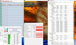 La prueba de estrés (Prime95 y Furmark en funcionamiento permanente) representa un escenario extremo para comprobar la estabilidad del sistema a plena carga. La CPU inicia la prueba a velocidades de reloj bajas o medias (núcleos P: aprox. 2,4 a 2,6 GHz; núcleos E: aprox. 1,9 a 2,3 GHz). La GPU va a máxima potencia (1.400 MHz). Los valores descienden a medida que avanza la prueba.