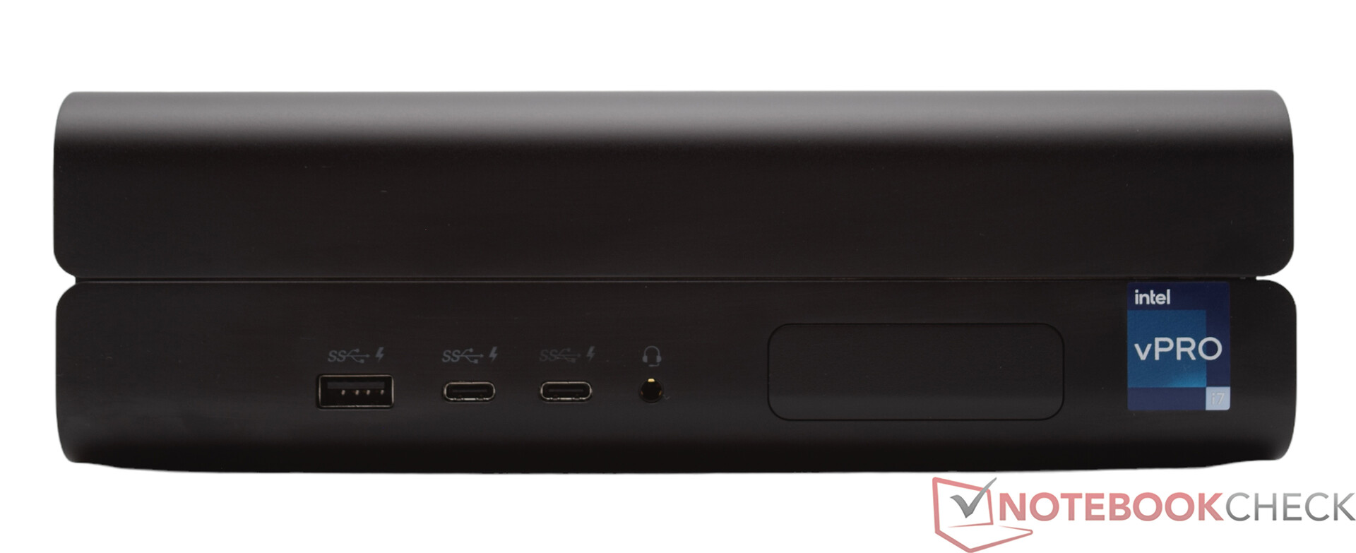 Aunque el HP Z2 Mini G9 no es necesariamente muy pequeño, el número de interfaces externas es relativamente manejable. A primera vista, vemos muchos puertos de monitor en la parte trasera, que están disponibles gracias a la tarjeta gráfica dedicada. La Nvidia RTX A2000 viene incluso con cuatro miniDP. Además, la iGPU del procesador también puede utilizarse para la salida de imágenes. Dos interfaces DisplayPort están disponibles en nuestra muestra de prueba del HP Z2 Mini G9. La mitad de los seis puertos USB se encuentran en la parte trasera y la otra mitad en el lado izquierdo de la carcasa. Sólo se pueden encontrar puertos Tipo-A en la parte trasera, aunque dos de las tres interfaces están instaladas como puertos Tipo-C en el lateral. Desafortunadamente, no hay funcionalidad USB4 o Thunderbolt en nuestra configuración de prueba.
