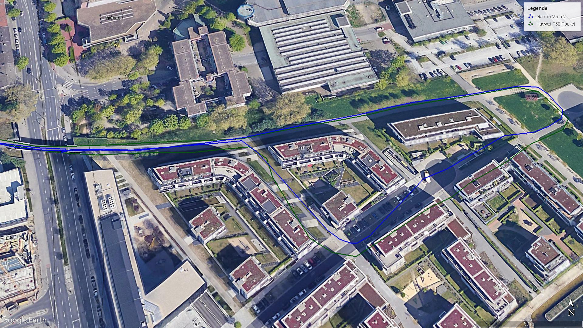 Evaluamos la precisión de localización de nuestra unidad de prueba en una prueba práctica, en la que grabamos una ruta en paralelo con un Garmin Venu 2 para comparar. Las desviaciones de las grabaciones de la ruta por parte del P50 Pocket son relativamente pequeñas, pero aún podemos ver algunas imprecisiones en la ruta grabada.