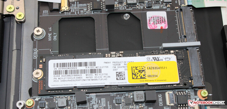 Puedes acceder al interior quitando la parte inferior de la carcasa. Algunos de los tornillos que tienes que quitar están escondidos debajo de unas plaquitas pegadas (ver fotos), y hay tornillos adicionales debajo de dos pies de goma pegados. Las plaquitas se pueden quitar con un destornillador plano pequeño. Una vez retirados los tornillos, hay que aflojar con cuidado la parte inferior de la carcasa, que de lo contrario podría doblarse con facilidad. Una herramienta plana para hacer palanca, como una espátula, resulta muy útil para esta tarea. Después de quitar la parte inferior, se tiene acceso a la SSD (PCIe 4, M.2-2280), la ranura para una segunda SSD (PCIe 4, M.2-2280), el ventilador, los altavoces y la batería.