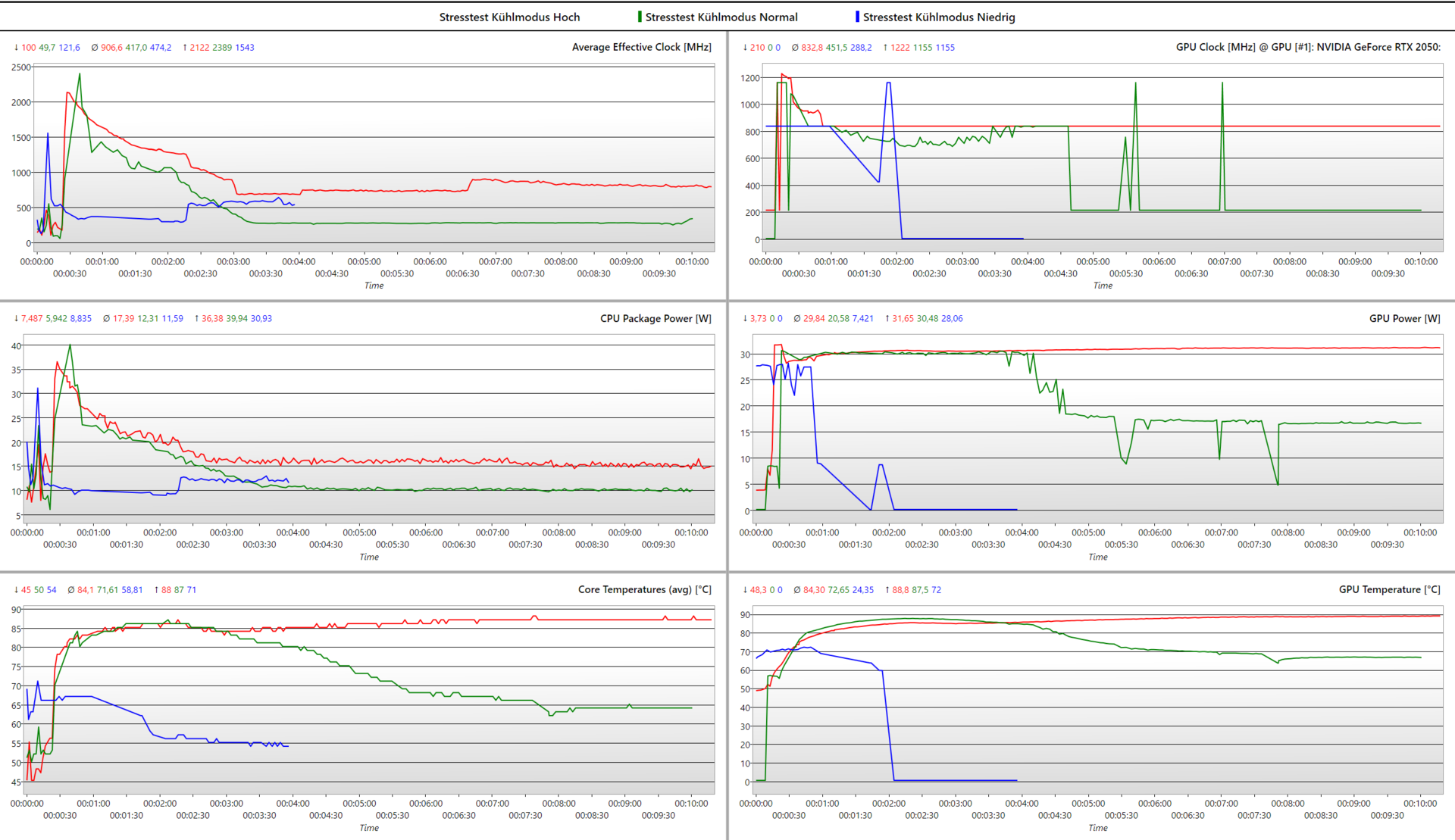 Tras una breve fase de arranque, la CPU y la GPU arrancan con un total combinado de 47 vatios. Durante toda la prueba de estrés, el rendimiento del Intel Core i7-1260P se mantiene estable en 15 vatios. En cambio, el rendimiento de la Nvidia RTX 2050 empieza a caer a los 8 minutos. Desde un punto de partida de 33 vatios, el registro registra sólo 26 vatios al final de la prueba de estrés. La diferencia de 7 vatios hace que el reloj de la GPU caiga de 830 a unos 500 MHz.