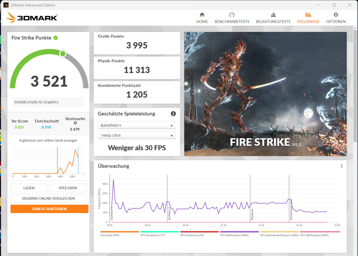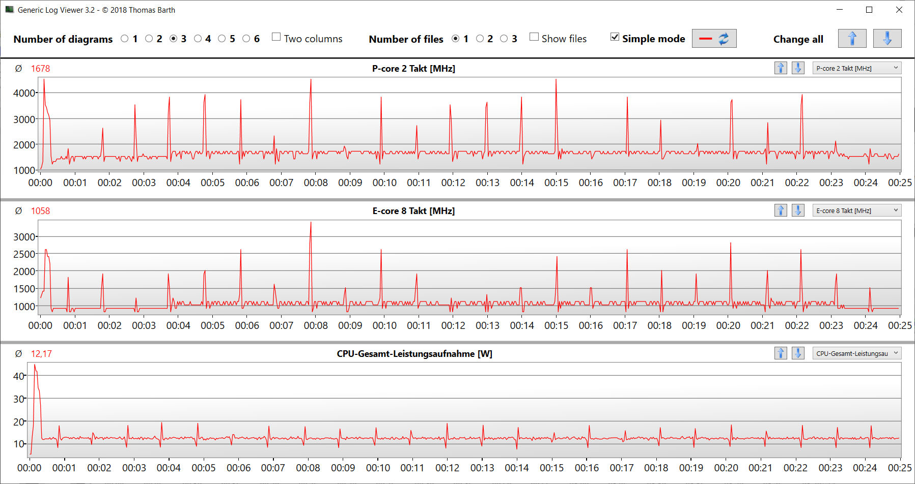 La prueba de estrés (con Prime95 y Furmark funcionando constantemente) representa un escenario extremo que utilizamos para evaluar la estabilidad del sistema a plena carga. Ya al principio de la prueba, la CPU (P: 2 GHz; E: 1,5 a 1,6 GHz) y la GPU (850 MHz) funcionan a bajas velocidades de reloj, y los valores descienden aún más durante la continuación de la prueba.