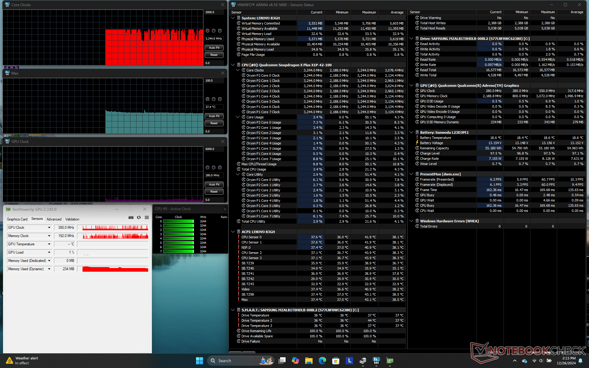 La duración de la batería sigue siendo uno de los aspectos más destacados de poseer un PC impulsado por Snapdragon en lugar de uno tradicional AMD o Intel. Hemos sido capaces de registrar una autonomía de algo más de 16 horas con el paquete de batería interna de 57 Wh de tamaño decente, en comparación con las "sólo" 9,5 horas del ThinkPad E14 G6 que funciona con el antiguo Core Ultra 7 155U. Los portátiles más nuevos con Lunar Lake, como el Asus Zenbook S 14siguen estando por debajo de nuestro Lenovo en un par de horas, incluso con su mayor paquete de baterías de 72 Wh.