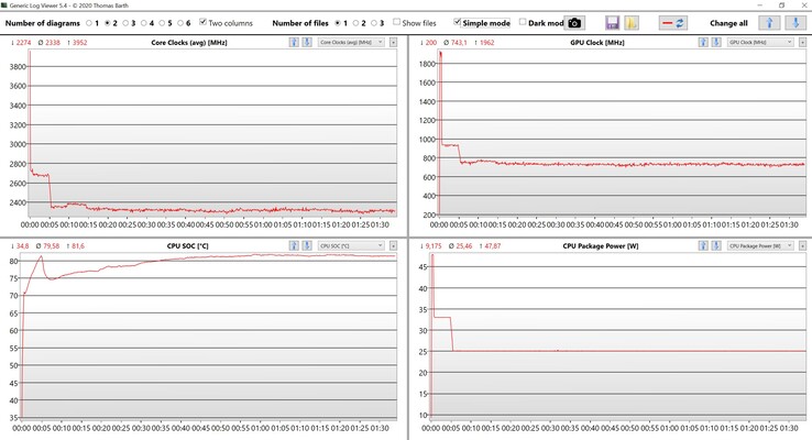 En situaciones cotidianas, no hay problemas de temperatura, pero al jugar o bajo carga alta, de nuevo se muestra el lado negativo de la ventilación de ventilador único. Nuestras imágenes térmicas muestran claramente que sólo el lado izquierdo de la carcasa se calienta y con picos de temperatura de unos 50 °C en la esquina izquierda, desaconsejaríamos poner el dispositivo sobre el regazo en este escenario extremo. En el test de estrés, el SoC se estabilizó rápidamente a 25w y luego permaneció estable a este nivel.