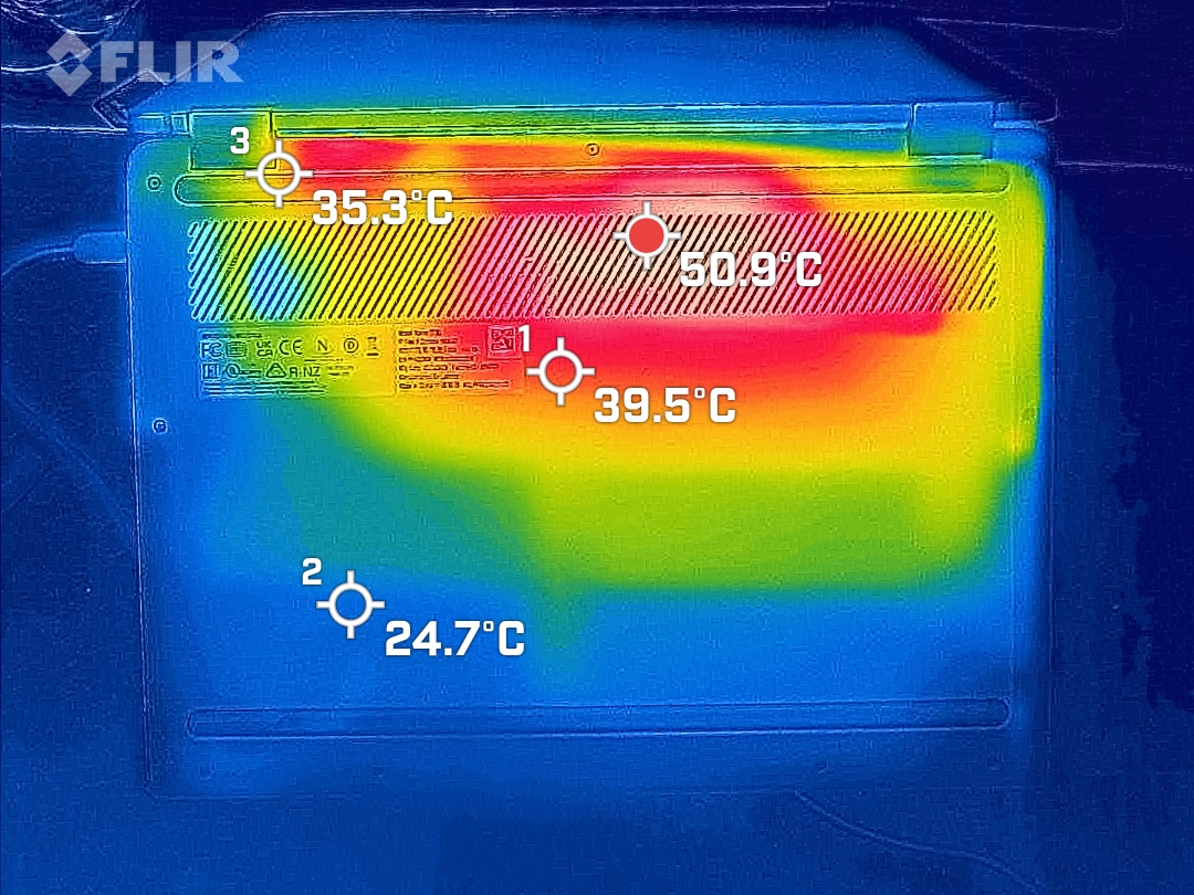 Incluso en la prueba de estrés, en la que el procesador y la tarjeta gráfica se utilizan al máximo, el dispositivo apenas se calienta. La temperatura máxima en la parte superior es de 41,4 °C.