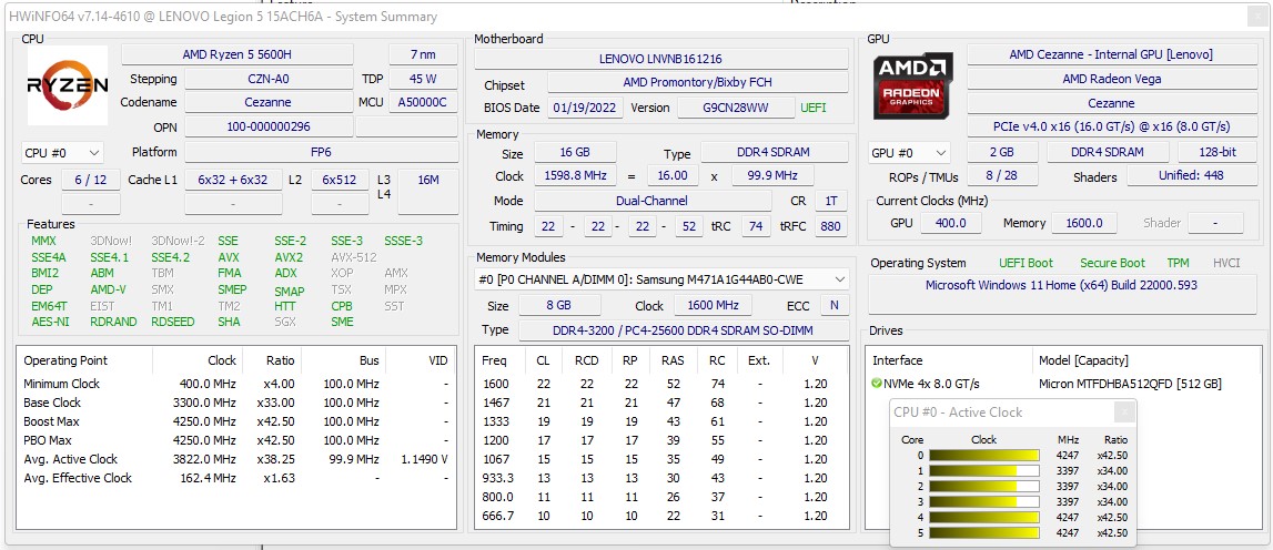 La serie Legion de Lenovo es un nombre conocido en el campo de los portátiles para juegos. Lenovo ha establecido esta marca desde hace varios años y sigue construyendo sobre ella. Este es también el caso del actual Lenovo Legion 5 15ACH6A, que viene equipado con un AMD Ryzen 5 5600H basado en la actual arquitectura Zen3. La GPU es la AMD Radeon RX 6600M, una nueva tarjeta gráfica móvil en el segmento de gama media que ofrece 8 GB de VRAM, lo que es apropiado para este rango de precios. El resto del hardware incluye 16 GB de RAM y un SSD de 512 GB, así como una pantalla de 165 Hz que refuerza el propósito del portátil.
