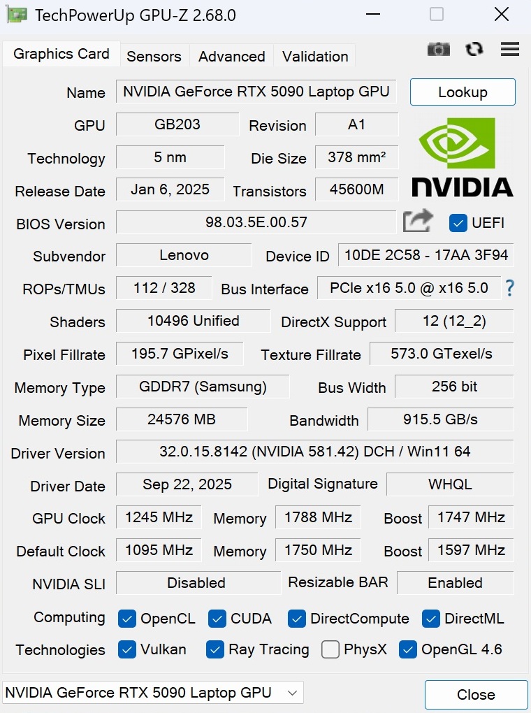 | Alienware 18 Area-51 Intel Core Ultra 9 275HX ⎘ Nvidia GeForce RTX 5090 Laptop ⎘ 64 GB Memoría | Amazon: $3,432.01 Precio de catálogo: 4400 USD | 4.2 kg | 24.32 mm | 18.00" 2560x1600 168 PPI IPS | |