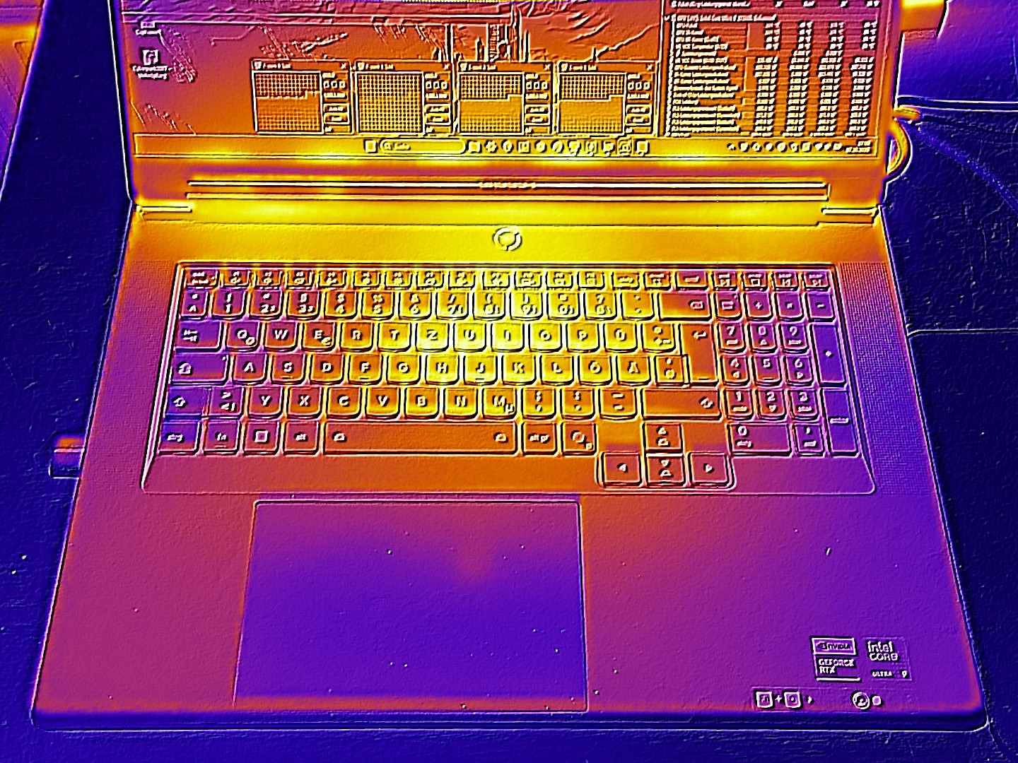 Al igual que con el modelo RTX 5080, la evolución de la temperatura es un tanto curiosa. Mientras que la Legion 9 18 ya se calienta relativamente en modo inactivo, las superficies del chasis apenas se calientan bajo carga, pero a veces alcanzan valores similares.