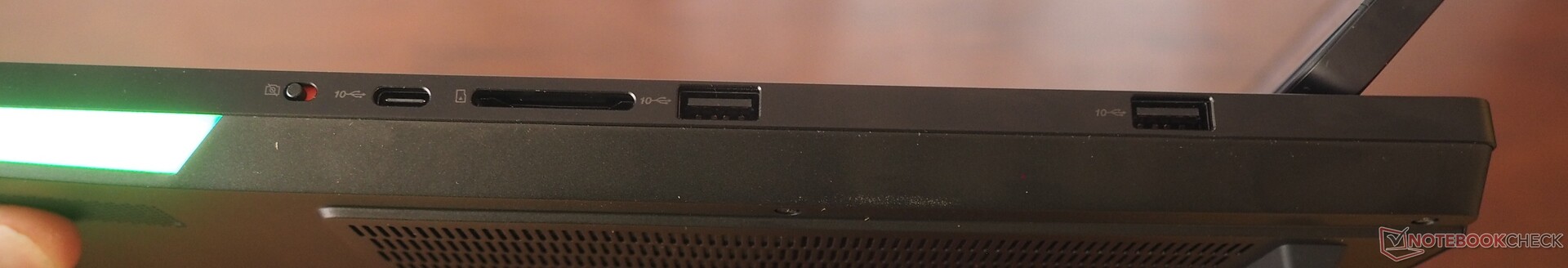 El número y la variedad de conexiones no dejan nada que desear, sobre todo porque Lenovo ha instalado interfaces modernas (véase más abajo). Curiosamente, el lector de tarjetas es más lento que en la versión RTX 5080, mientras que el módulo inalámbrico ofrece resultados significativamente mejores. La cámara web de 5 MP, que ofrece un obturador electrónico, produce imágenes decentes.
