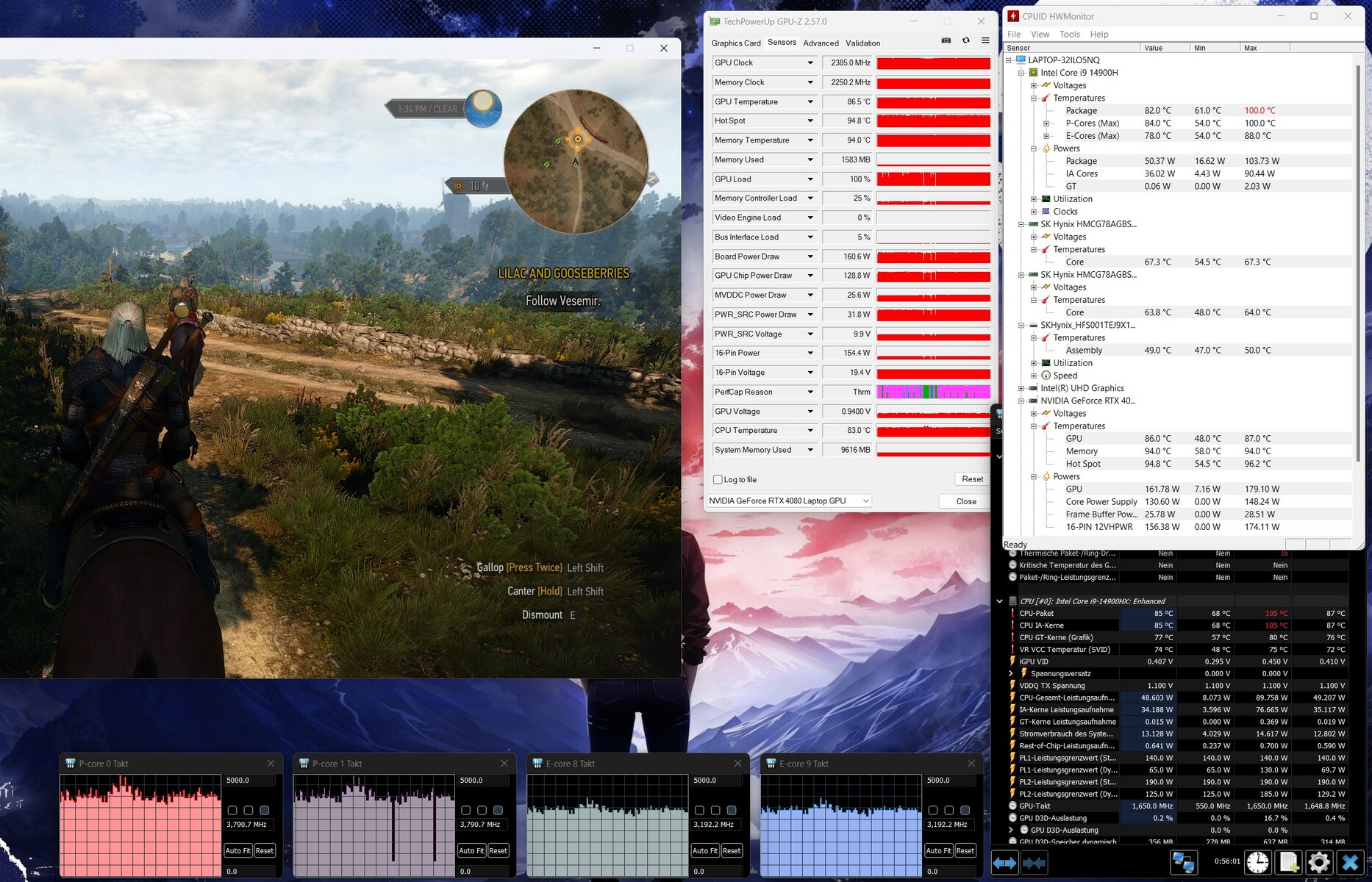El GeForce RTX 4080 y Core i9-14900HX en su interior lograron alcanzar sus nuevos mejores resultados en algunas de las pruebas - ambos chips son sin duda capaces de funcionar a pleno rendimiento constantemente. No hay forma de evitar las elevadas cantidades de calor y ruido habituales en esta clase de portátiles. Sin embargo, existe un modo silencioso para aliviarlo - a costa del rendimiento.