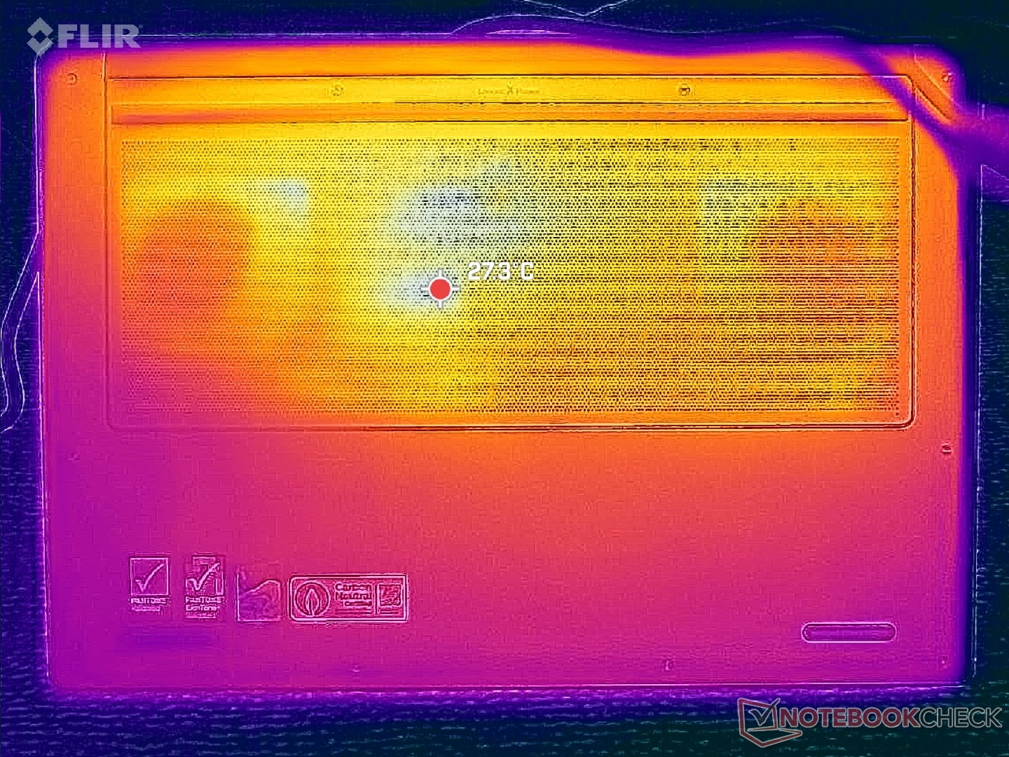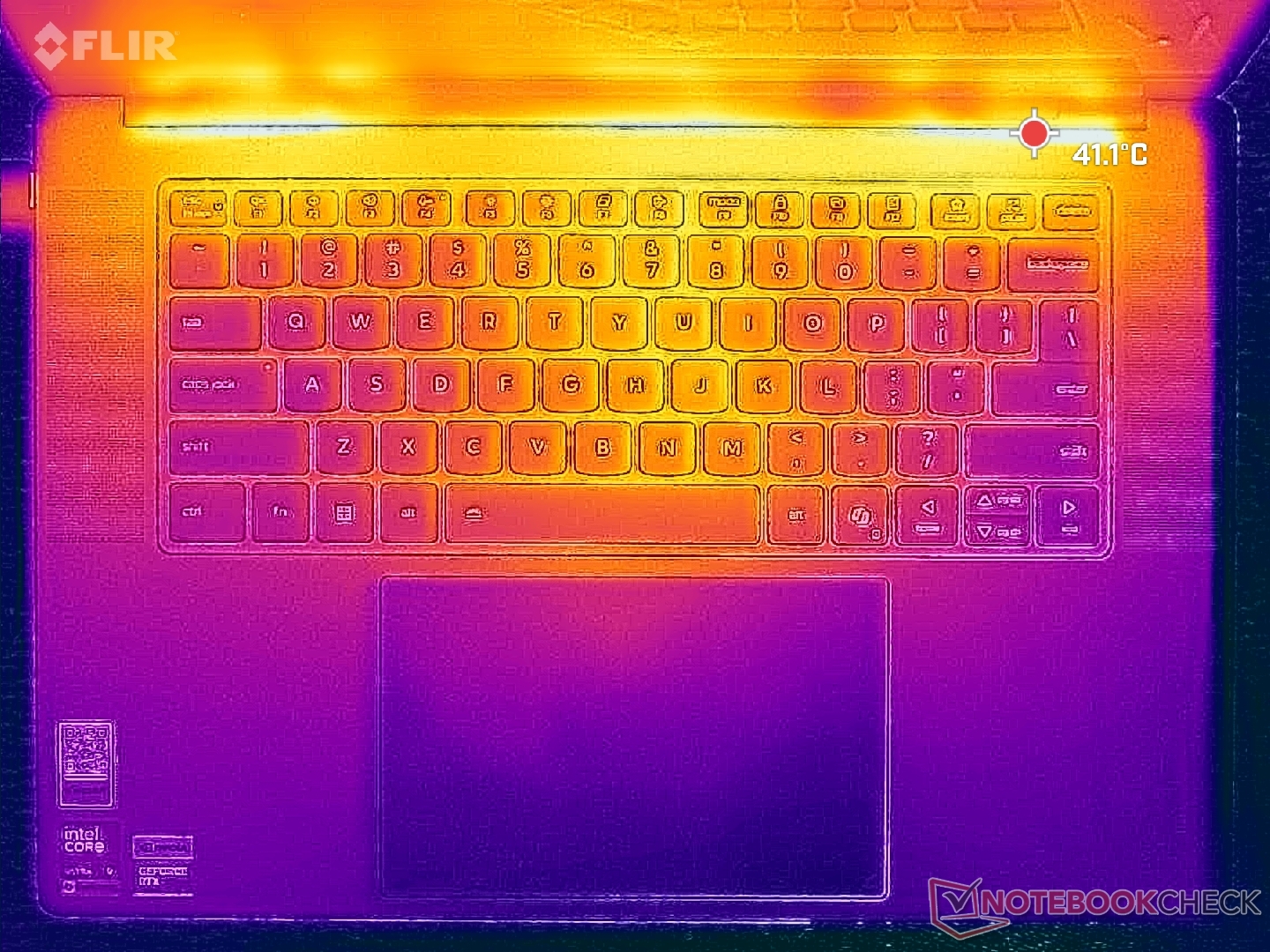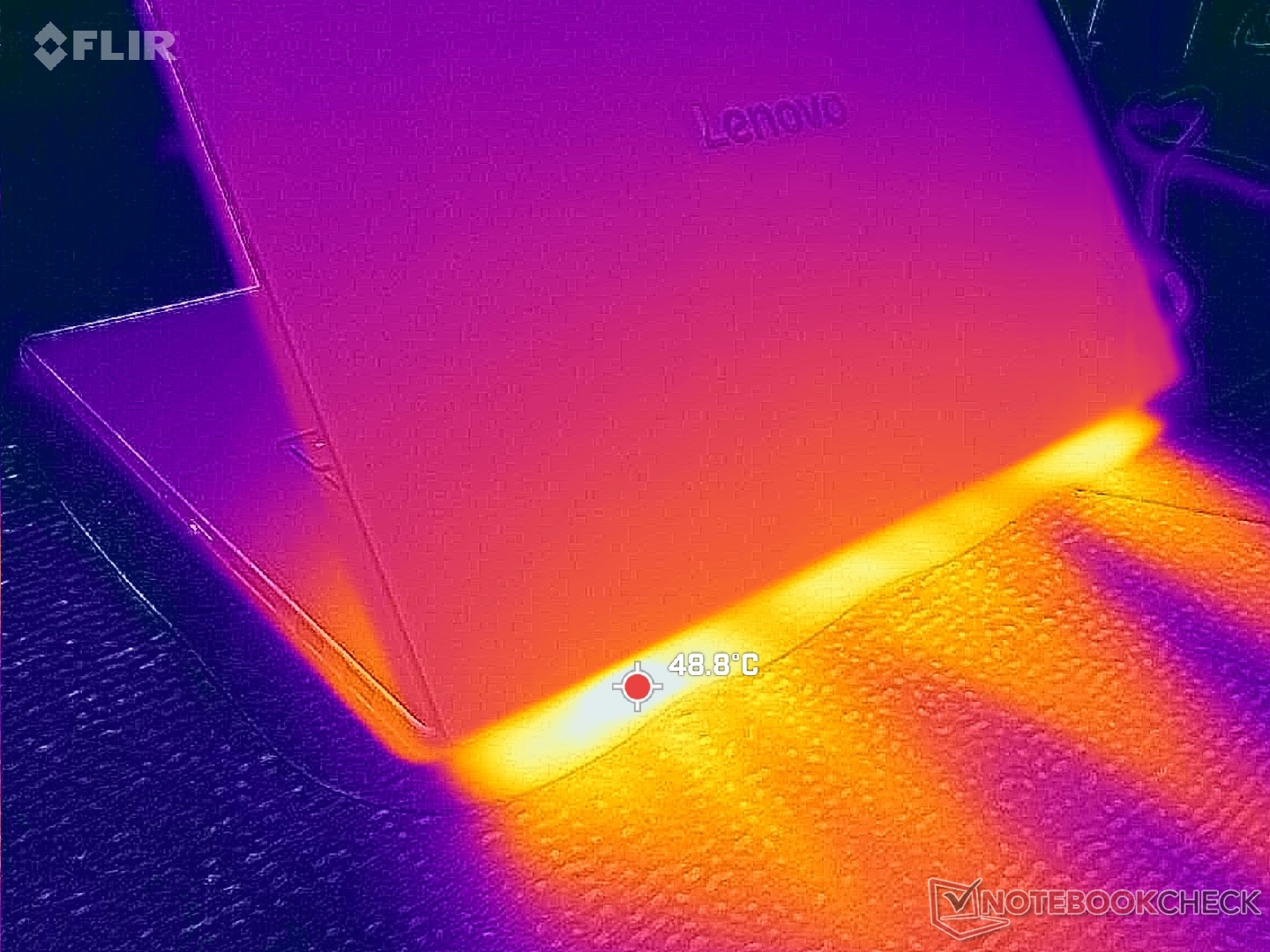 Las temperaturas de la superficie son notablemente más frías a pesar de las dimensiones más reducidas que el modelo saliente. Al ejecutar Cyberpunk 2077, por ejemplo, los puntos calientes de nuestra unidad alcanzaban sólo los 38 C y 41 C en comparación con los 42 C y 49 C del Yoga Pro 9i 16IAH G10 Aura con la misma GPU Nvidia.