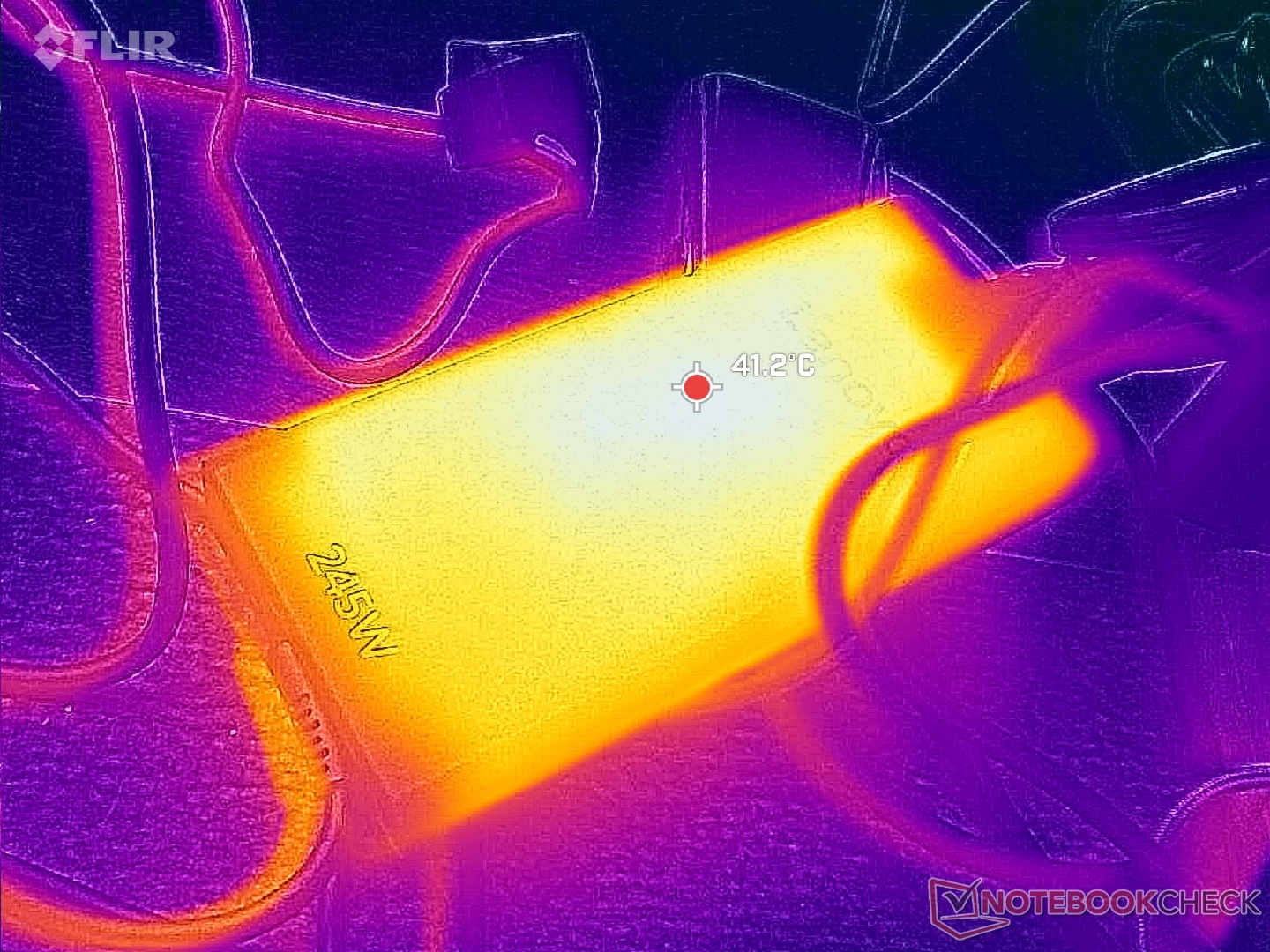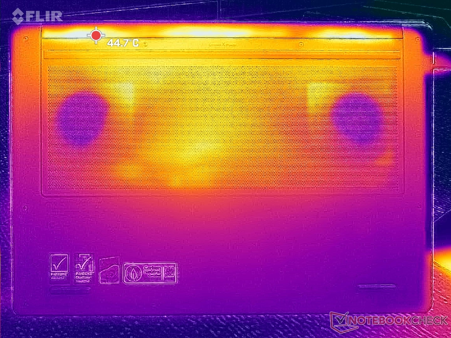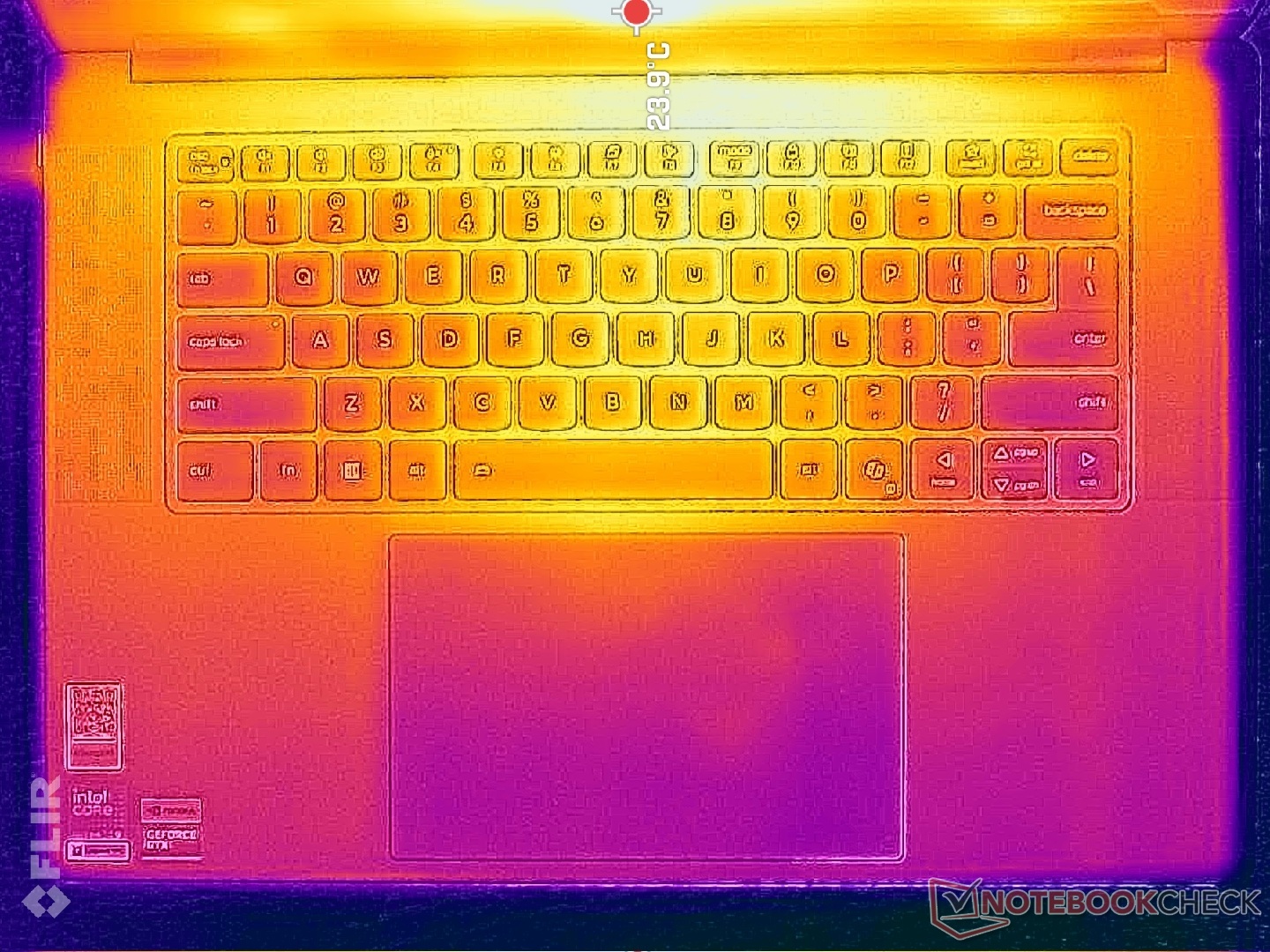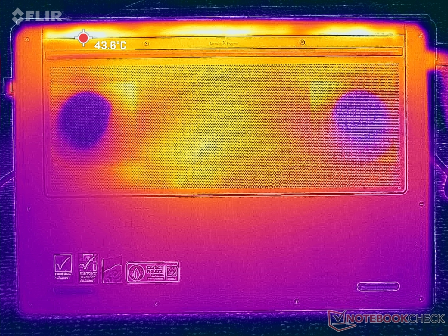 Las temperaturas de la superficie son notablemente más frías a pesar de las dimensiones más reducidas que el modelo saliente. Al ejecutar Cyberpunk 2077, por ejemplo, los puntos calientes de nuestra unidad alcanzaban sólo los 38 C y 41 C en comparación con los 42 C y 49 C del Yoga Pro 9i 16IAH G10 Aura con la misma GPU Nvidia.