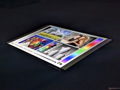 La pantalla OLED en tándem de nuestra unidad es exactamente el mismo panel Samsung ATNA60KA04-0 que se encuentra en el 2025 Yoga Pro 9i 16 para obtener la misma experiencia de visualización. Nuestras propias mediciones revelan un brillo central máximo de 931 nits en modo SDR y 1480 nits en modo HDR para hacer de esta una de las pantallas más brillantes en cualquier portátil de 16 pulgadas.