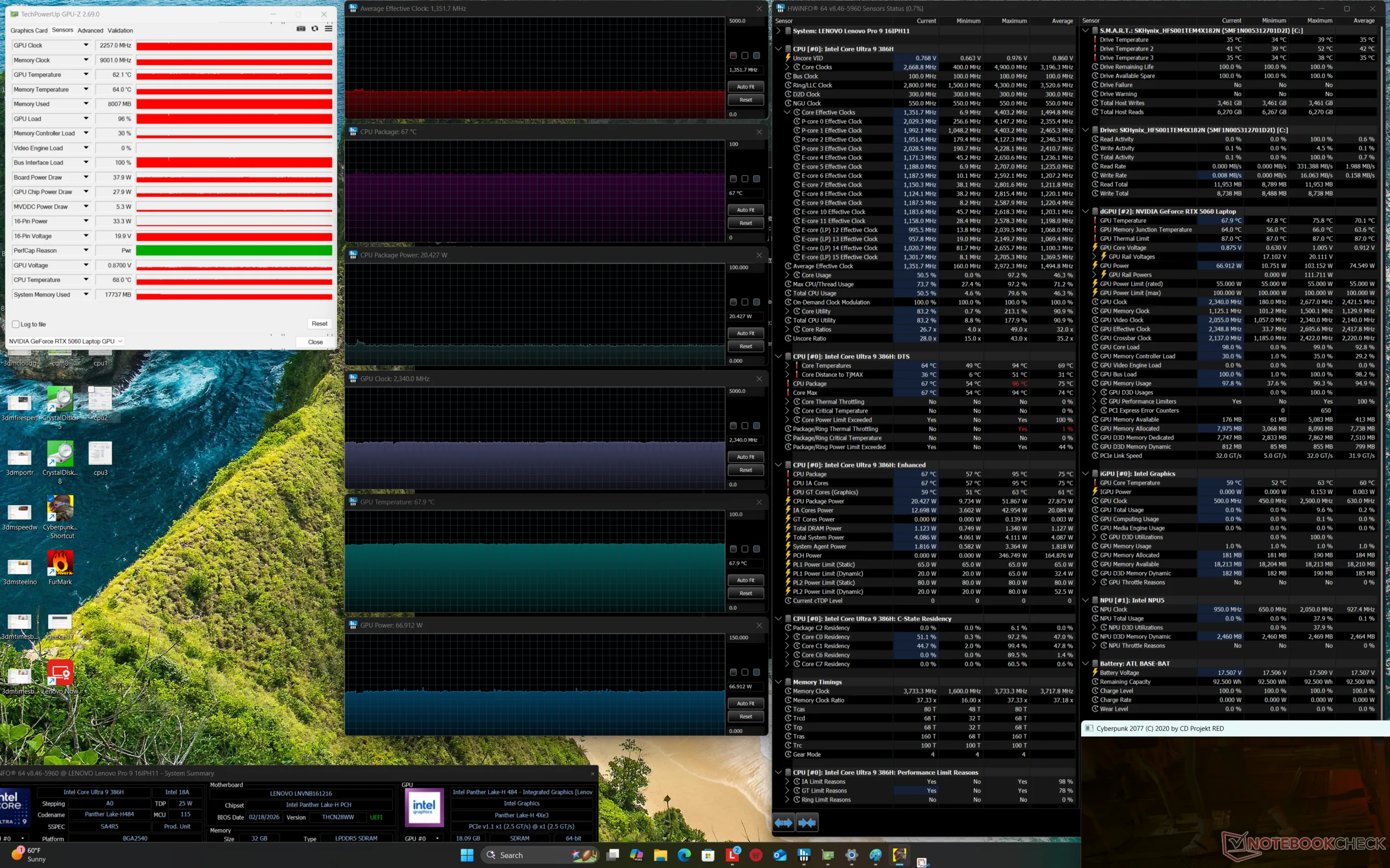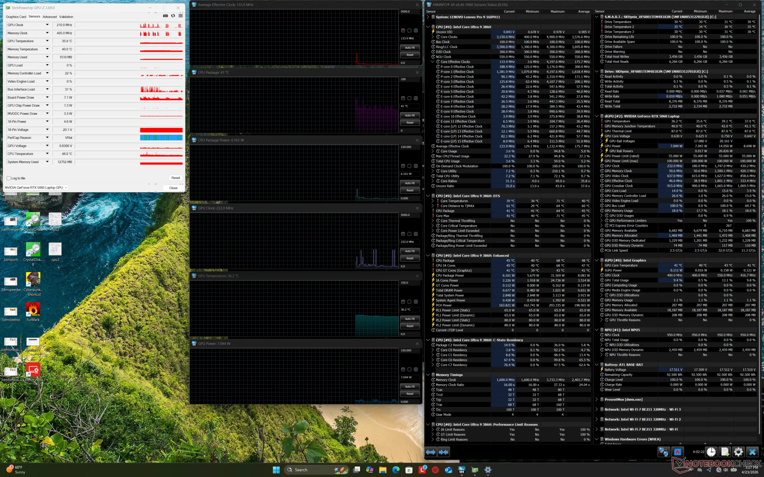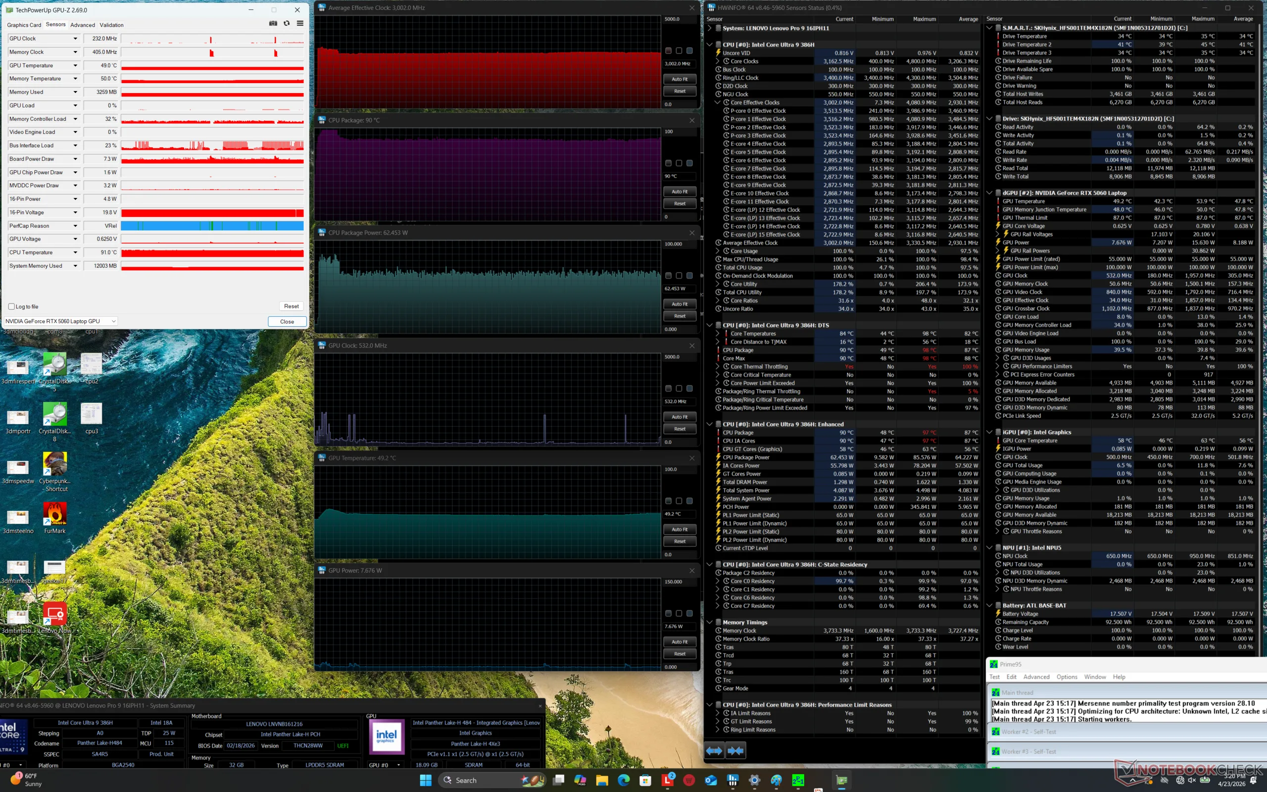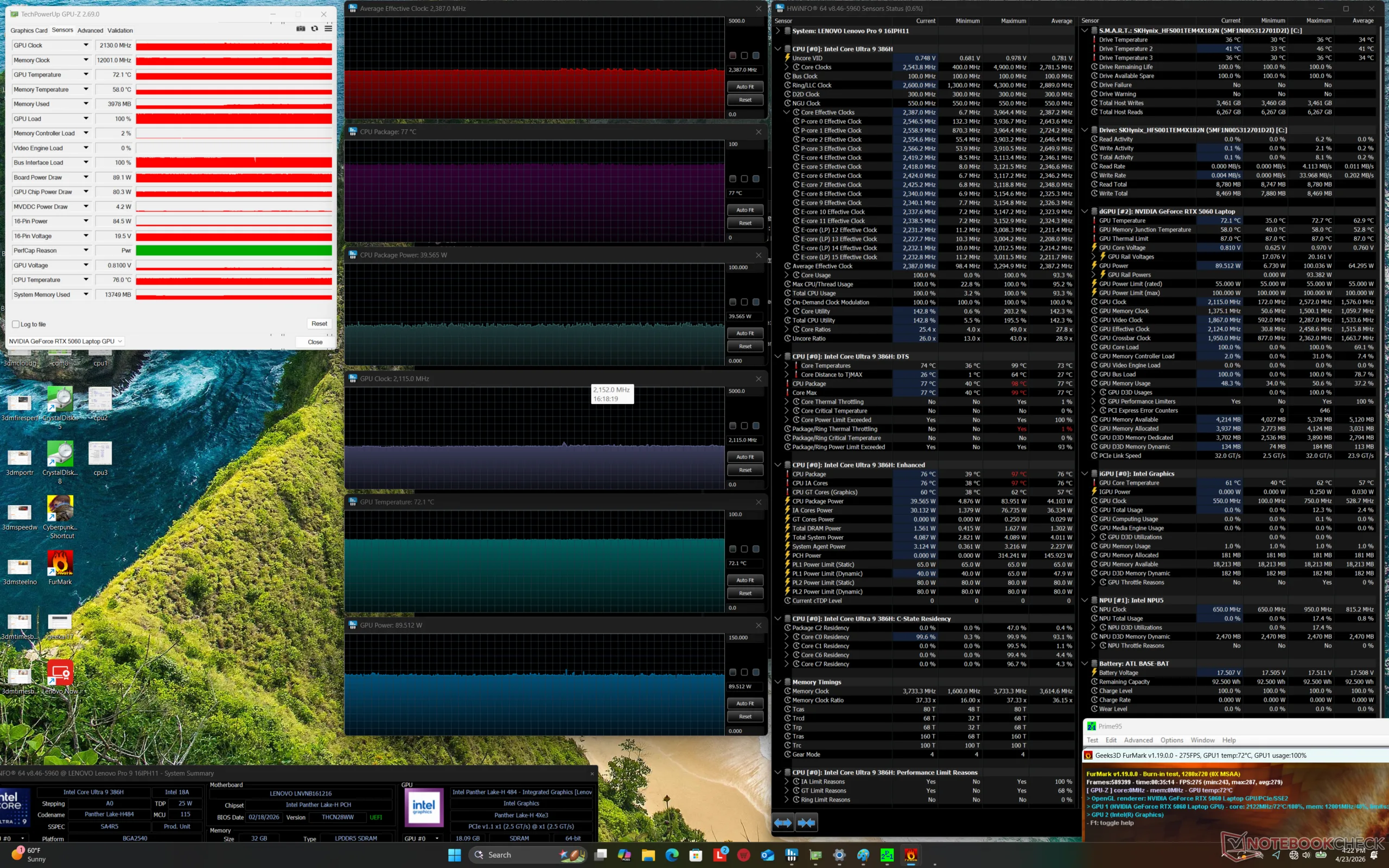 | Lenovo Pro 9 16IPH11 Ultra 9 386H, GeForce RTX 5060 Laptop, SK hynix PVC10 HFS001TEM4X182N, Tandem OLED, 3200x2000, 16" | Lenovo Yoga Pro 9 16IAH10 RTX 5050 Ultra 9 285H, GeForce RTX 5050 Laptop, WD PC SN7100S SDFPMSL-1T00-1101, OLED, 2880x1800, 16" | Dell XPS 16 Core Ultra X7 358H Ultra X7 358H, Arc B390 Panther Lake iGPU, , OLED, 3200x2000, 16" | MSI Prestige 16 AI Evo B2HMG Ultra 9 285H, Arc 140T, Micron 2500 1TB MTFDKBA1T0QGN, IPS, 2560x1600, 16" | HP Omen Transcend 16-u1095ng i9-14900HX, GeForce RTX 4070 Laptop GPU, Kioxia XG8 KXG80ZNV1T02, OLED, 2560x1600, 16" | Asus ProArt P16 H7606WP Ryzen AI 9 HX 370, GeForce RTX 5070 Laptop, WD PC SN740 SDDPNQE-2T00, OLED, 2880x1800, 16" | |