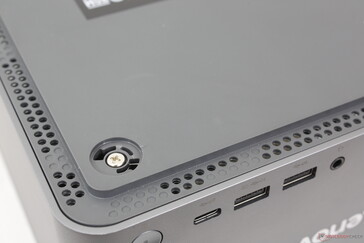El chasis cúbico es mayoritariamente de aluminio para ofrecer una primera impresión sólida, especialmente si se compara con otros mini PC que tienden a utilizar más plástico que metal para ahorrar costes. El esquema de color gris mate oscuro es similar al de la serie ThinkBook para una estética apropiada para los negocios.