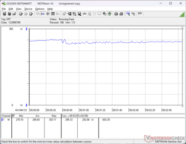 El sistema utiliza tanto una CPU como una GPU de sobremesa, por lo que el consumo de energía será superior al de muchos otros mini PC que suelen funcionar con componentes móviles. Simplemente en ralentí sobre el escritorio consumiría hasta 27 W en el mínimo en comparación con sólo 6 W en el Beelink SER9, más pequeño y más débil. Ejecutar cargas más exigentes como juegos demandaría casi 300 W de media para ser más hambriento de energía que la mayoría de portátiles para juegos.