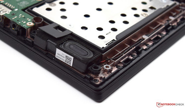 Los dos altavoces en la parte frontal del dispositivo son aceptables para uso en la oficina. Las voces son fuertes y claras sin distorsionarse al máximo volumen. Sin embargo, la reproducción puede ser bastante pesada en los máximos. Los altavoces externos se pueden conectar a través de un combo-jack de auriculares.