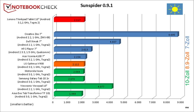 En el banco de pruebas Sunspider, la tablet Lenovo quedó al mismo nivel que otros contendientes Tegra 2, con 2117 ms. sólo la LG Optimus V900, la Motorola Xoom, la Samsung Galaxy Tab 10.1v y la Asus Transformer fueron mas veloces. Por tanto, con todo, es un resultado positivo con respecto al rendimiento, comparado con otras tablet PCs actualmente disponibles.