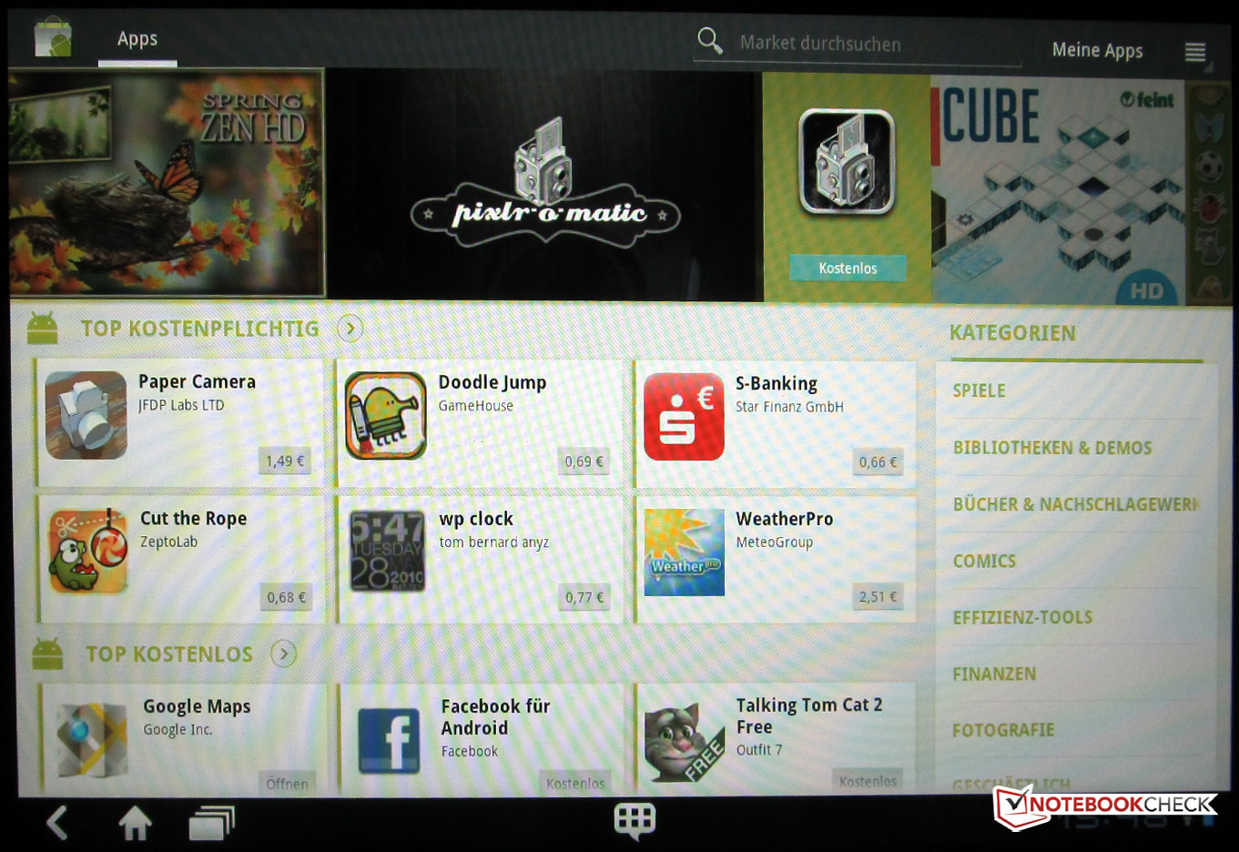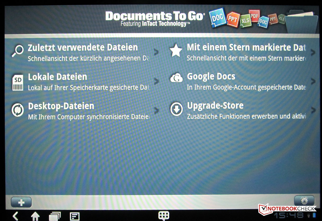 En el estado en que se entrega, esta tablet de precio razonable a 666 Euro (versión 64 GB) tiene un notable número de apps preinstaladas. Con ‘Documents to Go’ puedes editar tus documentos de oficina (Microsoft etc) sobre la marcha. ‘Docs to Go’ soporta ficheros doc, docx, exl, ppt, y pdf. Los últimos dos sólo en modo lectura.