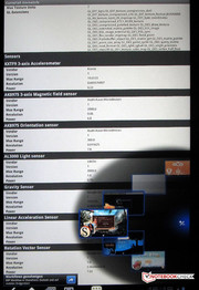 Hay siete sensores funcionando en la tablet, que detectan datos sobre su localización, orientación, o campo magnético, por ejemplo. El sensor de movimiento (giróscopo) lee los tres ejes de la tablet (ejes x, y, z), que puede usarse en juegos (por ejemplo) para controlar el personaje o vehículo.