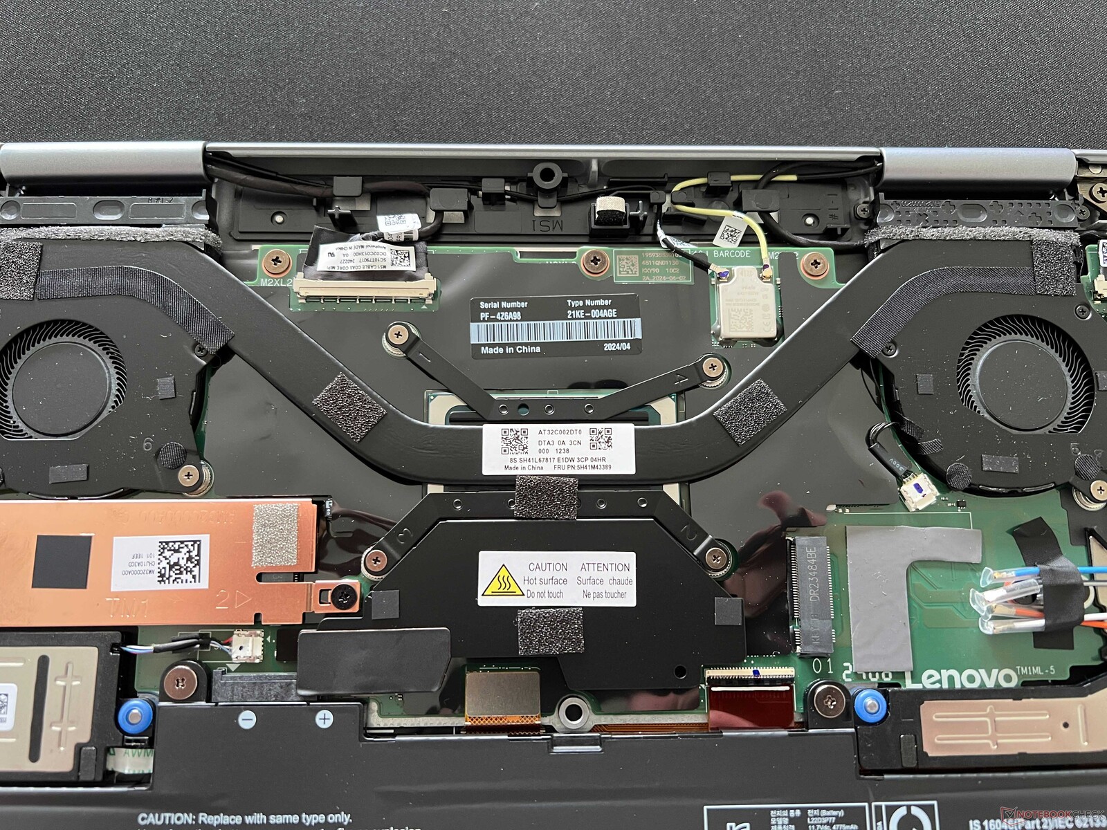 La tapa inferior de la carcasa está fijada mediante tornillos Philips normales y puede retirarse con bastante facilidad. En el interior, puede limpiar los ventiladores y, si es necesario, cambiar la batería o la unidad SSD M.2 2280. También se puede instalar un módulo WWAN, mientras que la RAM y el módulo WLAN están soldados.