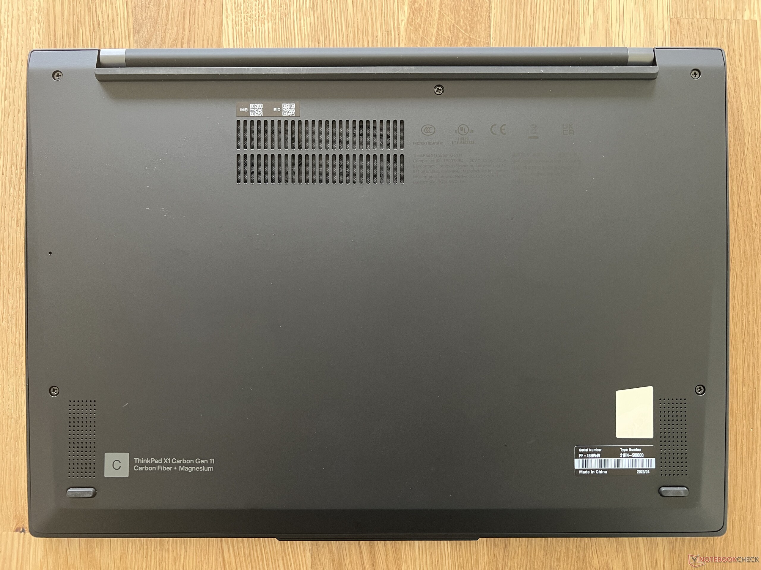 Lenovo ha adoptado la carcasa negra sin cambios del modelo del año pasado. La combinación de fibra de carbono y plástico reforzado de la tapa, así como la aleación de magnesio y aluminio de la unidad base, garantizan una carcasa extremadamente estable y una calidad de construcción impecable. Las superficies lisas también son muy agradables al tacto, pero hay que limpiarlas con regularidad, ya que las zonas muy usadas empiezan a verse algo moteadas al cabo de un tiempo, algo que también experimentamos con el predecesor. También comparamos el nuevo G11 con nuestro G7 particular y el nuevo modelo es un poco más delgado debido al panel de relación de aspecto 16:10, pero también algo más profundo. En cuanto al grosor de la unidad base, no hay cambios. Con algo menos de 1,2 kg, el X1 Carbon G11 sigue siendo móvil en general y no ocupa mucho espacio en el equipaje de mano.