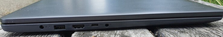 En cuanto a las conexiones, uno de los puertos USB-A se ha trasladado al otro lado, y otro puerto USB-A se ha sustituido por un puerto USB-C que, por desgracia, sólo soporta la transferencia de datos, aunque uno de los puertos USB sólo soporta USB 2.0. En comparación con el V15, falta el RJ45, pero sigue habiendo el (lento) lector de tarjetas SD (con tarjetas SD que sobresalen unos 16 mm, ~0,6 pulgadas). También se incluye HDMI 1.4b y un puerto de audio de 3,5 mm. Aunque 2.16 kg es bastante ligero para un portátil de 17 pulgadas, los dispositivos de 16 pulgadas de nuestra comparación son bastante más compactos.