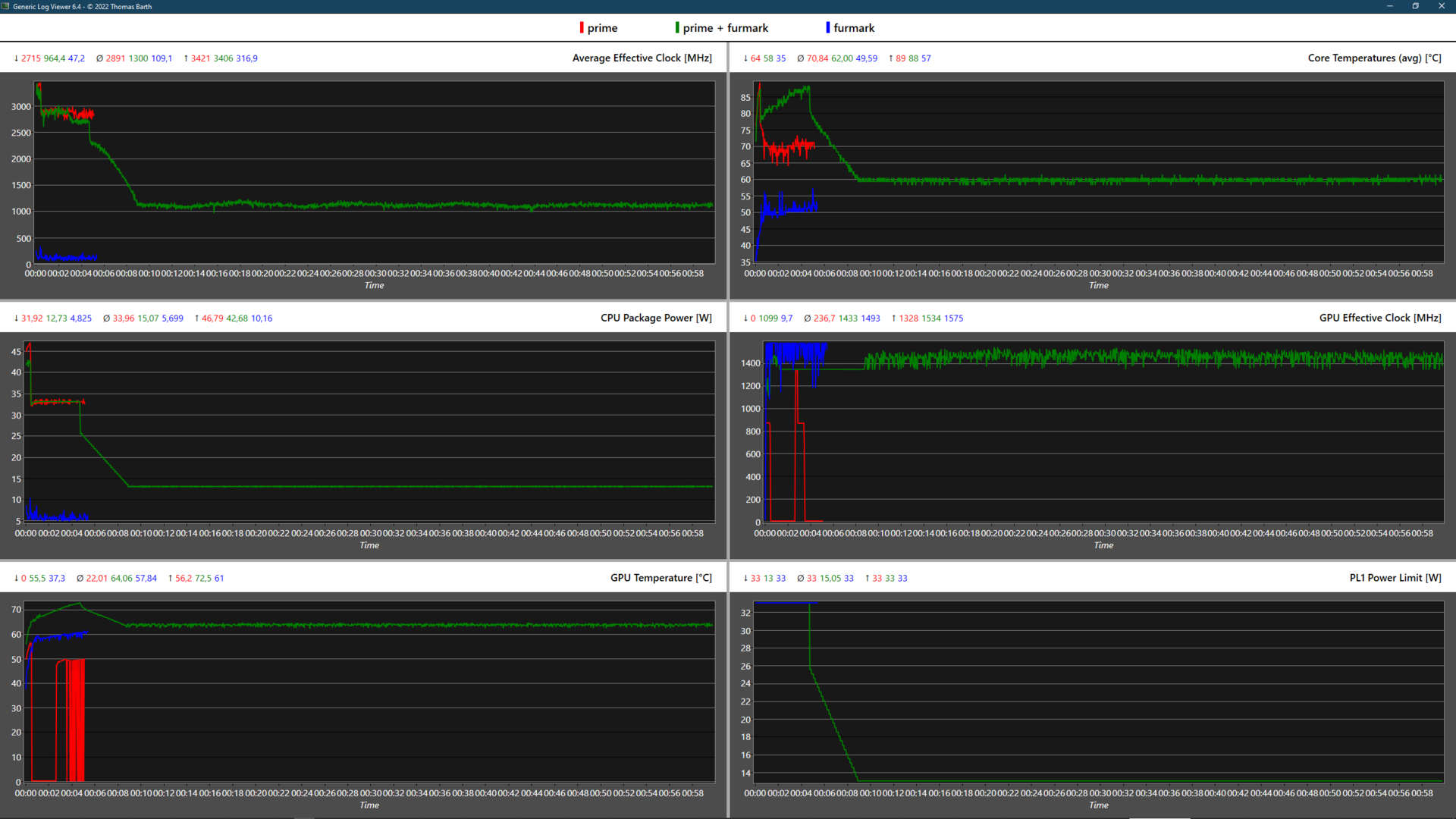 En el test de estrés de una hora de duración (FurMark + Prime95), la velocidad de reloj de la CPU empieza a 3.4 GHz pero luego cae a 2.85 GHz tras sólo un minuto, antes de nivelarse en el cuarto minuto a su valor final de 1.1GHz. En este punto, el límite de potencia 1 se reduce de 33 a 15 vatios y se da prioridad a la GPU Nvidia: Funciona a una velocidad constante de 1.433 MHz (velocidad de reloj básica), calentándose sólo a 63 °C en la caja grande