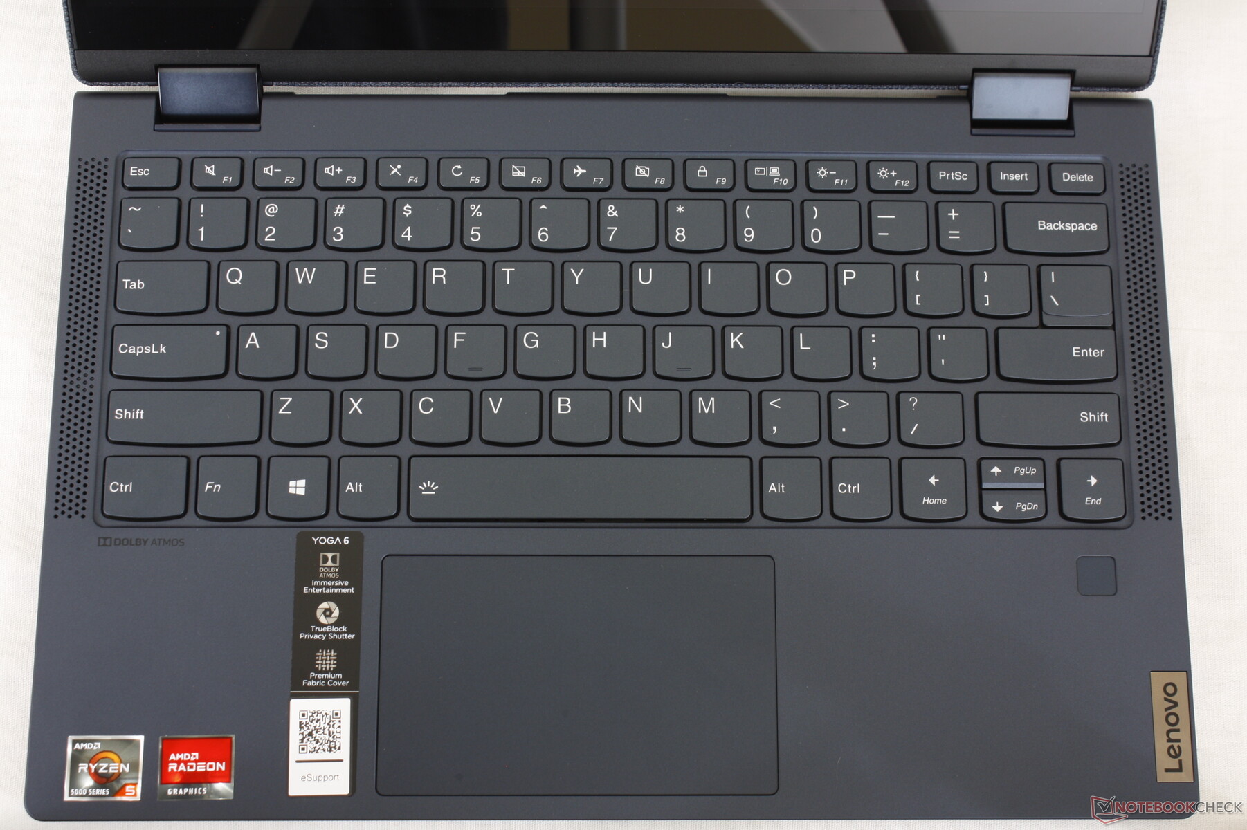 La distribución de las teclas ha cambiado ligeramente respecto a otros portátiles Yoga. En particular, la fila superior de funciones secundarias es ahora diferente de las teclas del Yoga 9i 14 o del Yoga Slim 7 debido en parte a la inclusión de un interruptor de apagado de la cámara.