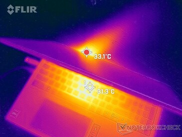 Las temperaturas de la superficie no son tan cálidas ni siquiera cuando se ejecutan cargas exigentes. Los puntos calientes en la parte superior e inferior pueden alcanzar 39 C y 35 C, respectivamente, en comparación con los 41 C a 48 C del Huawei MateBook D 16 2022 o de 45 C a 47 C en el LG Gram 16. Estos puntos calientes están hacia la parte trasera del chasis, dejando el reposamanos más fresco.