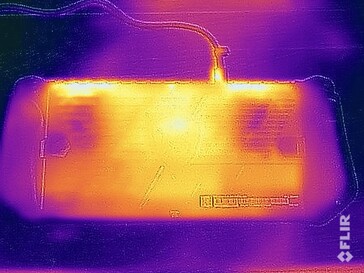 El dispositivo portátil para juegos de MSI no es especialmente eficiente. A pleno brillo, el dispositivo de prueba ya consume 12 vatios en reposo. Durante la prueba de estrés, sólo alcanzó los 65 vatios momentáneamente antes de equilibrarse en torno a los 54 vatios tras varios segundos. Al jugar, también alcanza unos 55 vatios, por lo que la fuente de alimentación de 65 vatios incluida es suficientemente potente.