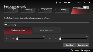 Sus principales métodos de entrada son los capacitivos del dispositivo, así como los controles de su "gamepad", como sus dos joysticks, el D-pad y los botones adicionales. La pantalla táctil en sí funciona perfectamente, pero utilizar Windows sólo con una pantalla táctil (especialmente una pequeña) sigue siendo muy cansado y la configuración inicial no es terriblemente divertida. Lo ideal es disponer de un monitor que alimente el dispositivo y al que también se puedan conectar directamente un ratón y un teclado. En cuanto haya terminado con Windows, todo gira en torno al software del fabricante, en este caso, MSI Center M. El lanzador se puede iniciar automáticamente al arrancar el dispositivo y aquí se pueden realizar cambios en todos los ajustes. Además, todos los servicios de juego importantes como Steam, UPlay, XBox, Epic, EA y Battlenet ya están integrados, lo que facilita enormemente la instalación de juegos. También hay un menú rápido, que se puede mostrar en cualquier momento y se puede utilizar para cambiar rápidamente los ajustes más importantes (perfil de energía, brillo, conexión Wi-Fi). El menú también es muy personalizable y, en general, el software Center-M funciona a la perfección y parece estar muy bien desarrollado. Sólo su monitorización en tiempo real (tres modos diferentes) está vinculada a la esquina superior izquierda y la visualización de FPS no funcionó en ninguno de los juegos que probamos.