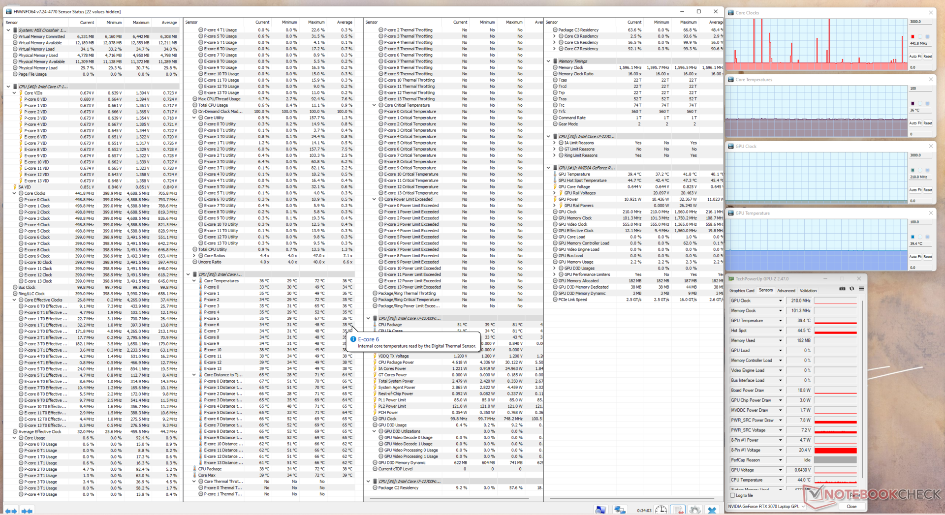 Al añadir FurMark, el Crosshair 15 R6E desplaza una parte del presupuesto total de energía a la RTX 3070. Esto se traduce en una reducción del promedio de frecuencias de reloj del núcleo de la CPU a 1,9 GHz con una caída de la potencia media del paquete a 47,4 W. La RTX 3070 es capaz de alcanzar cerca de su pico de reloj de 1,9 GHz y mantenerse a 1,54 GHz. Al hacerlo, la GPU consume cerca de 195 W de potencia máxima y una media de unos 101 W. Las temperaturas medias de la CPU y la GPU rondan los 85,6 °C y 79 °C, respectivamente.