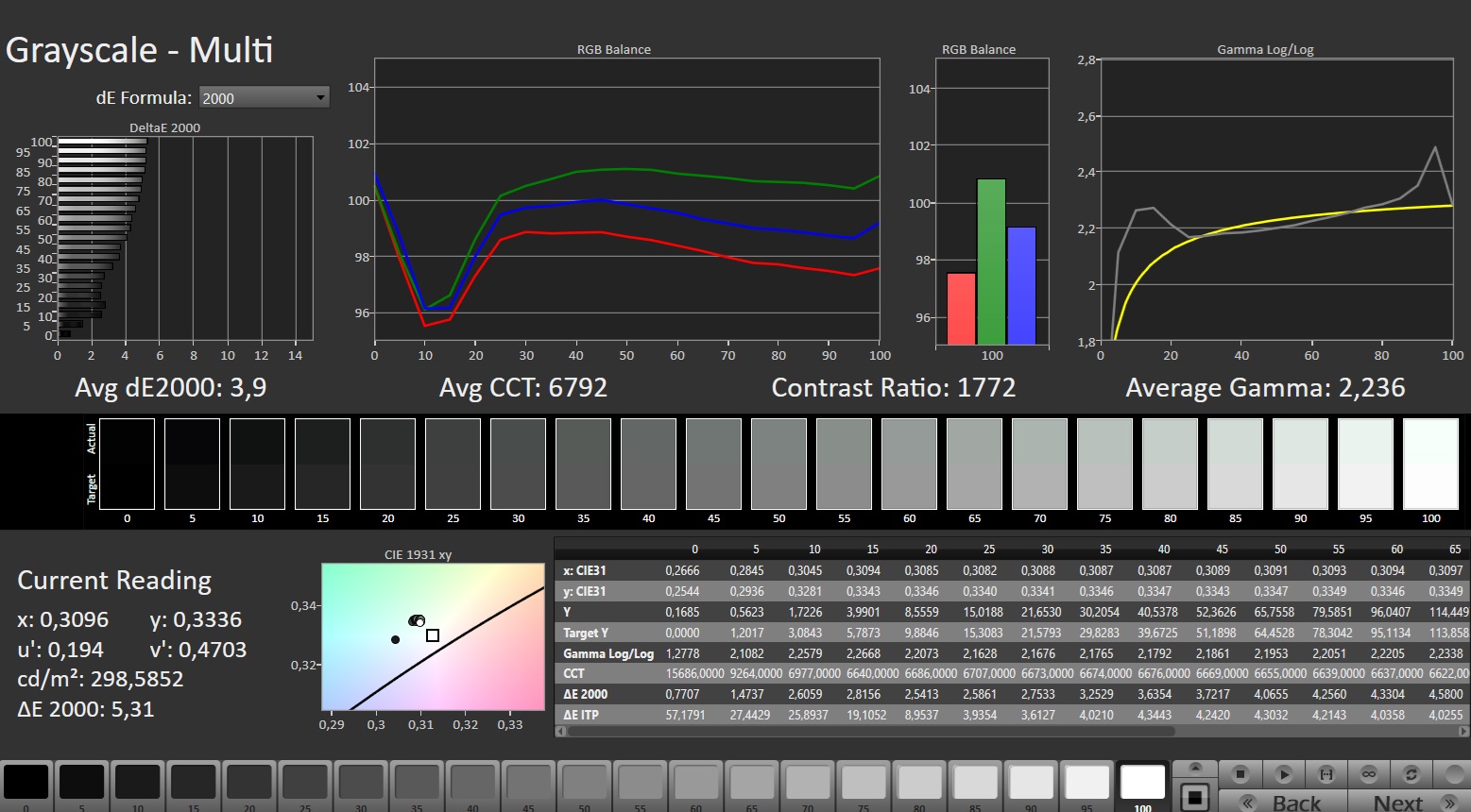 | Greyscale dE 2000 * | 3.9 | 2.16 45% | 2.4 38% | 3.9 -0% | 1.9 51% | 1.2 69% |