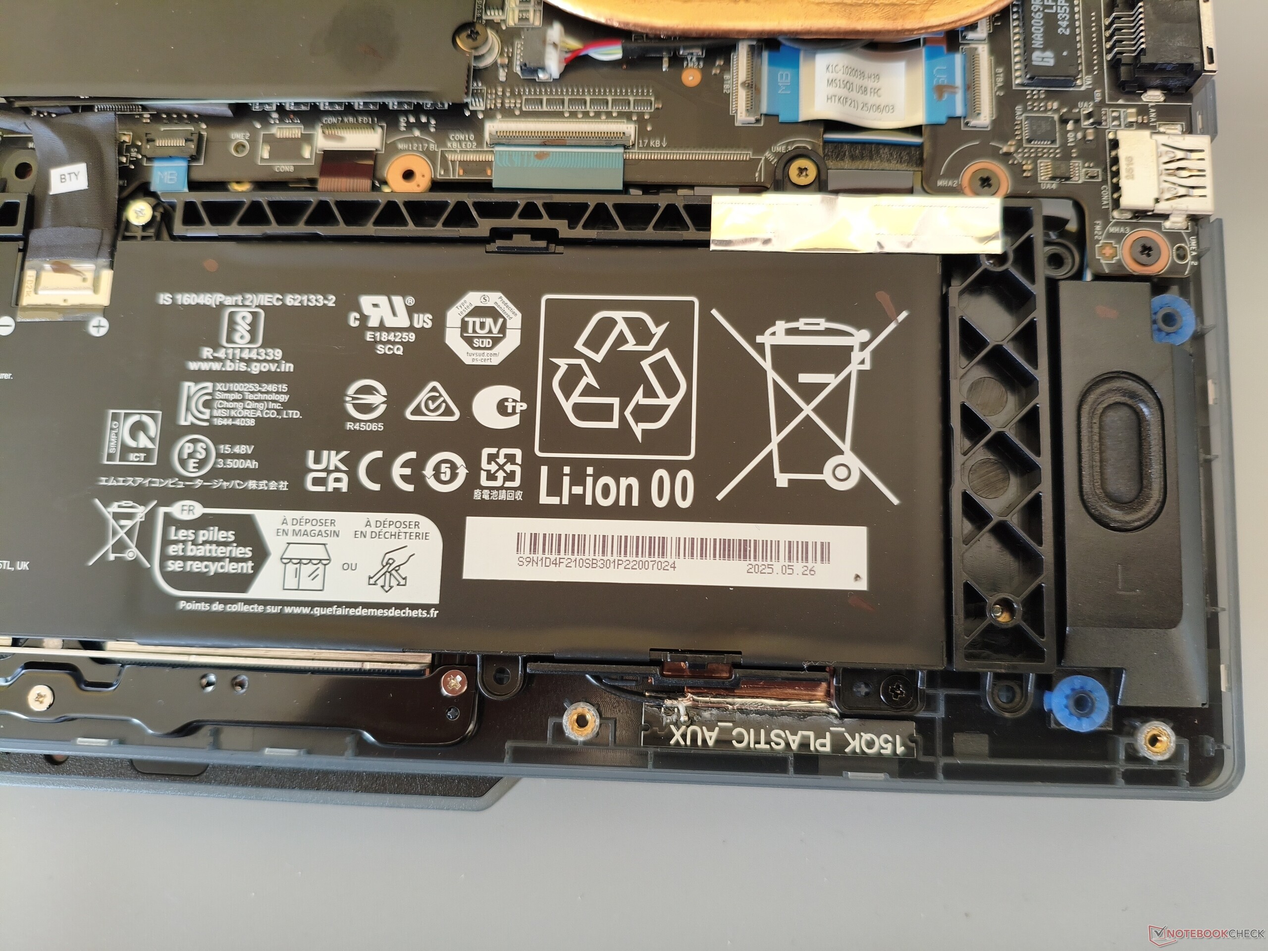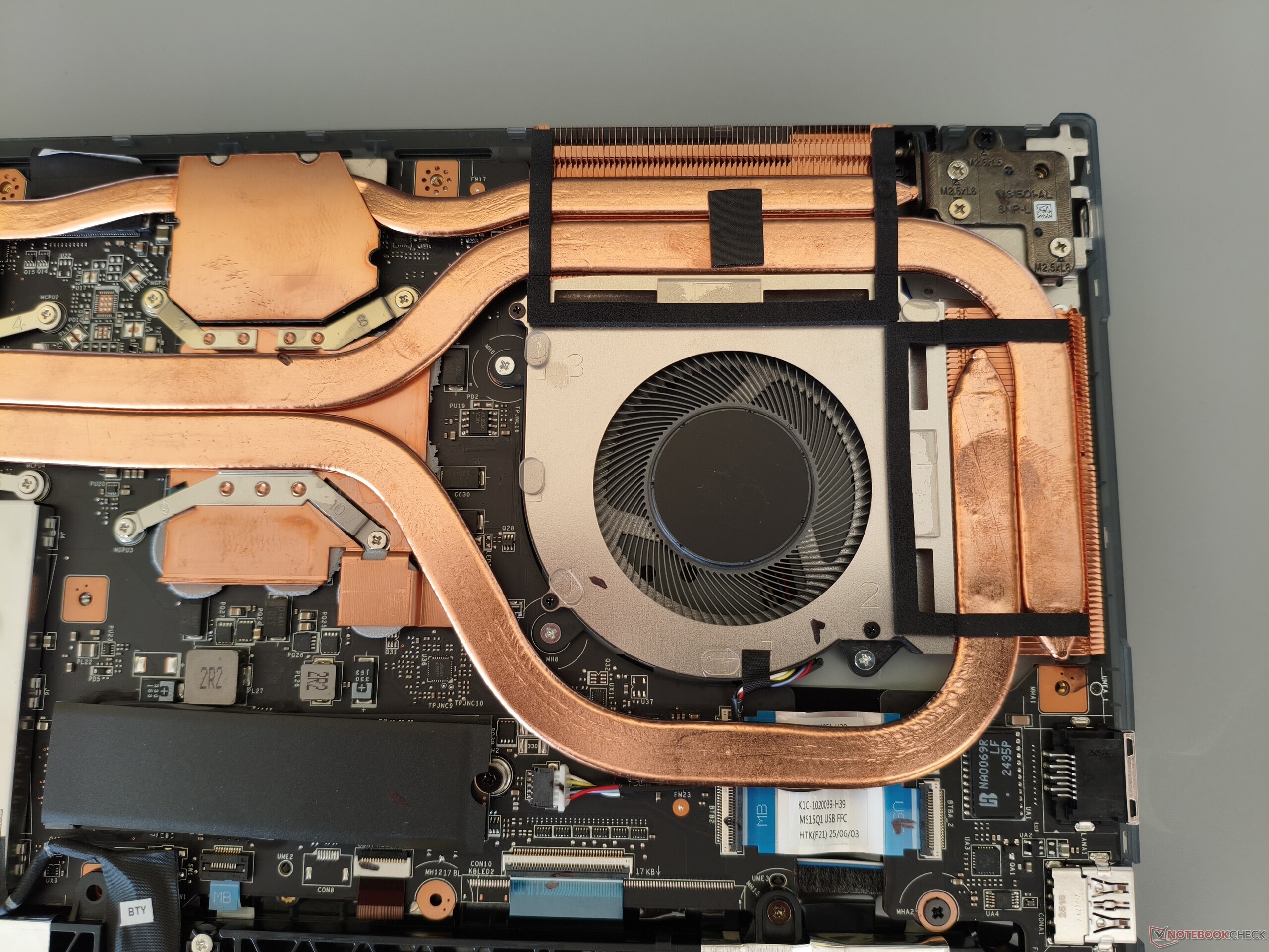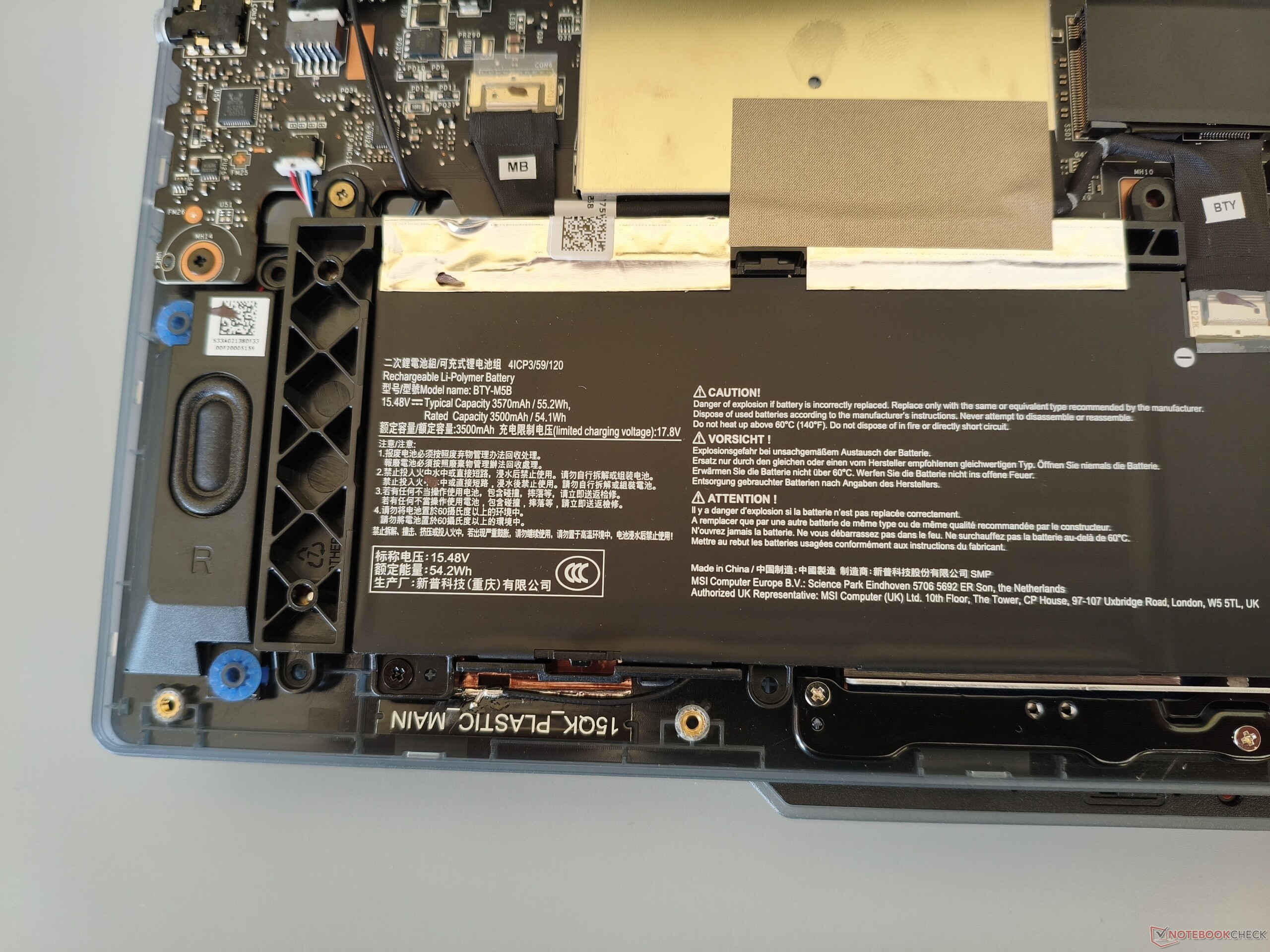 Para la carcasa se utiliza una mezcla de metal (tapa) y plástico (unidad base). En su mayor parte, la mano de obra y la estabilidad no dan lugar a críticas. MSI merece un elogio especial por el generoso ángulo de apertura de 180°. Con un peso de algo menos de 2,2 kg (~4,9 libras), el Cyborg 15 se sitúa cómodamente en medio de la competencia, que pesa entre 1,9 y 2,4 kg (~4,2 y 5,3 libras). Para abrir la carcasa, hay que retirar 12 tornillos Phillips. Puede ver cómo es bajo el capó en las siguientes imágenes.