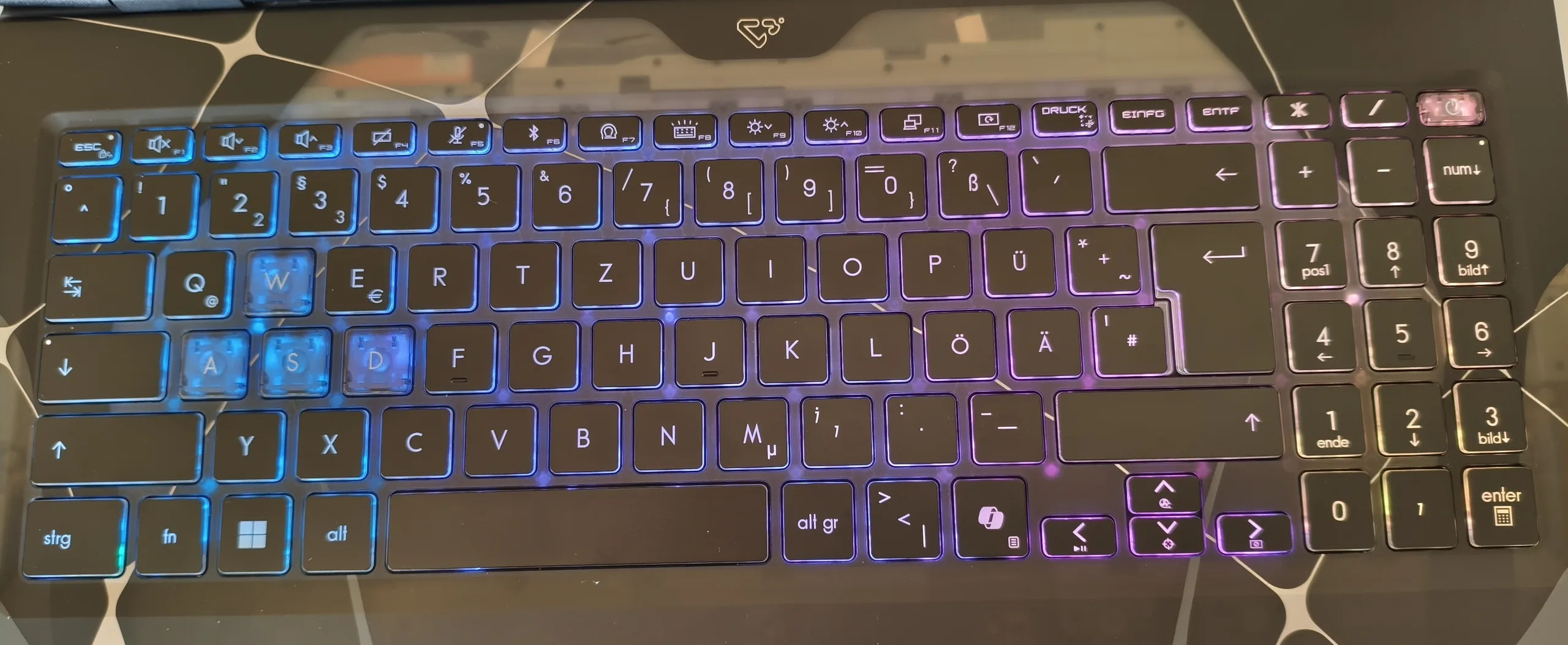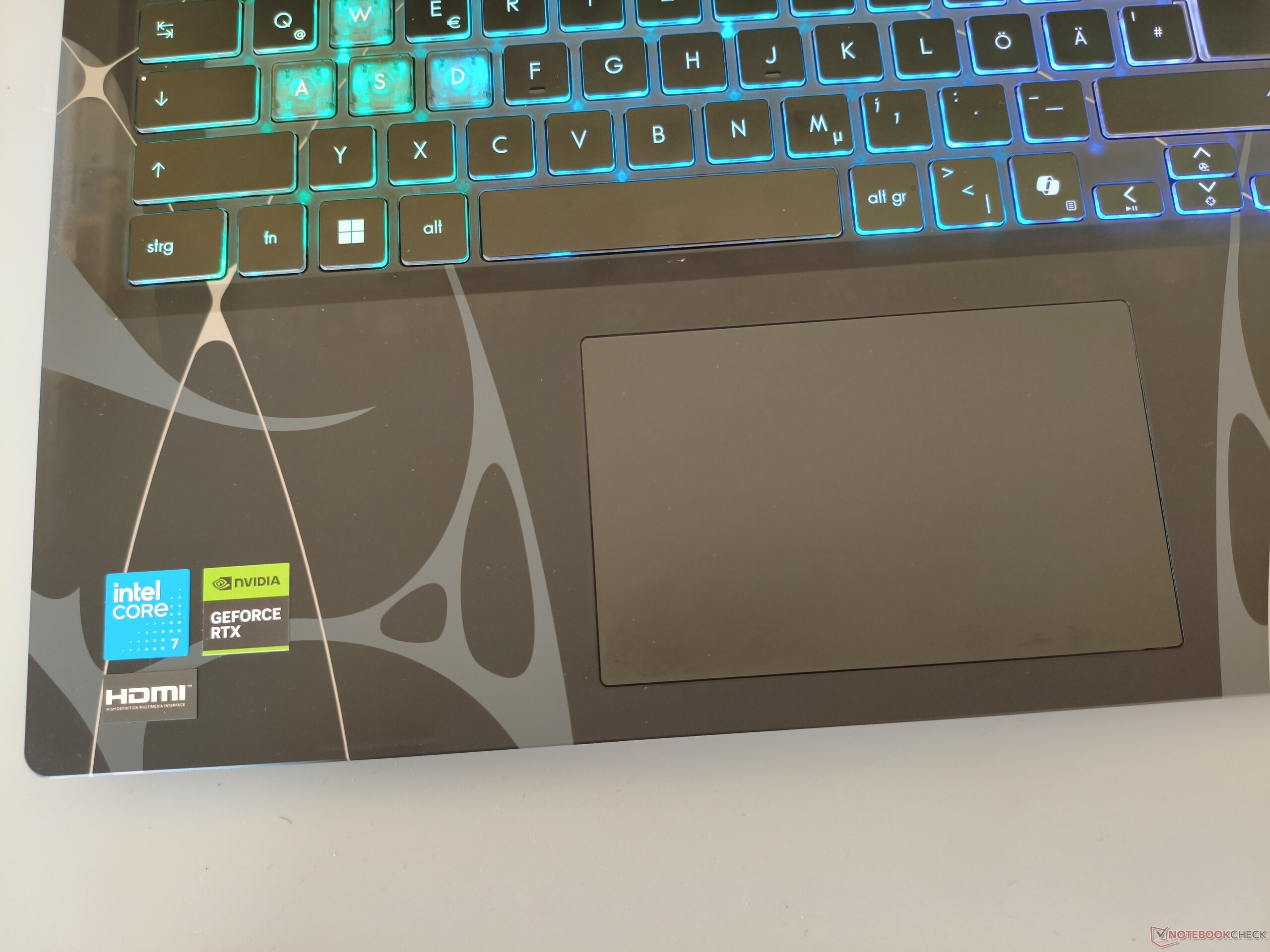 El teclado requiere una cierta familiarización debido a la disposición idiosincrásica típica de MSI. El hecho de que el teclado numérico sólo tenga tres columnas en lugar de cuatro también requiere acostumbrarse. Describiríamos la sensación de tecleo en sí como sólida. Los jugadores también pueden esperar una iluminación RGB relativamente potente. El touchpad mide 12 x 7,6 cm, lo que es más que suficiente para un dispositivo de 15 pulgadas. El sustituto del ratón rinde a un nivel satisfactorio en la prueba en cuanto a precisión, propiedades de deslizamiento y gestos.
