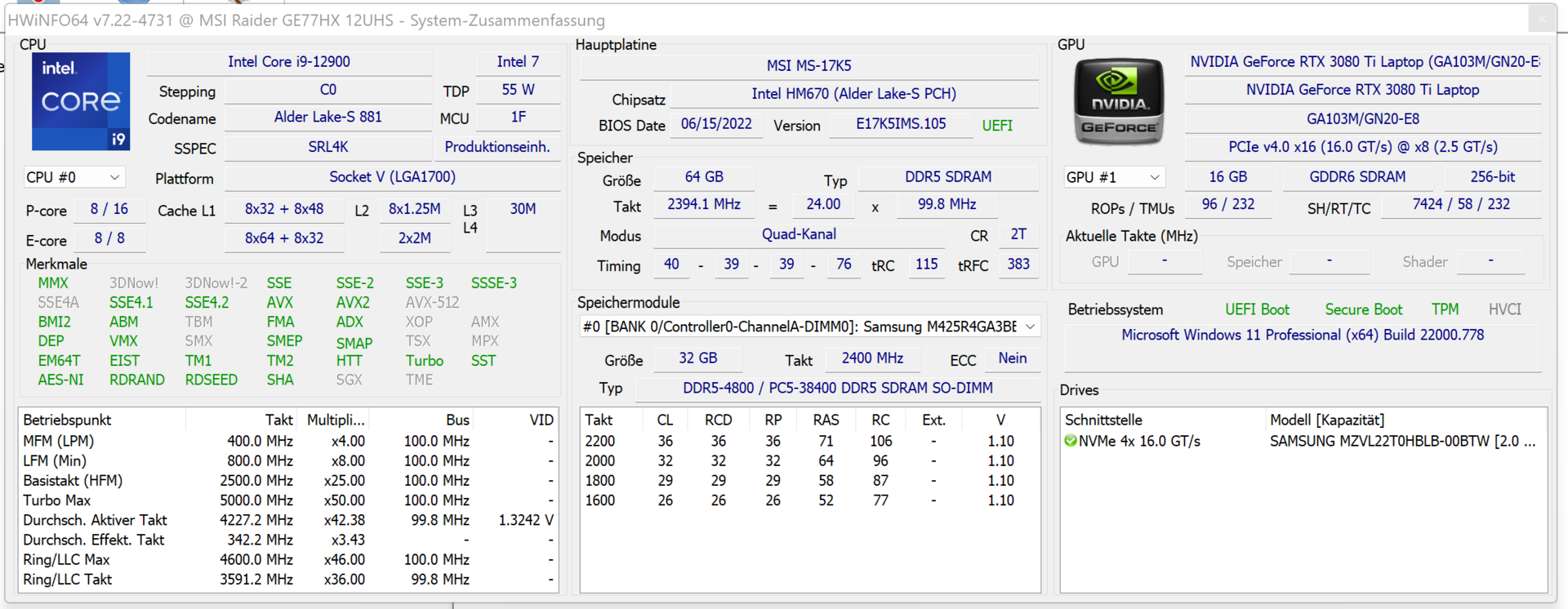 | MSI Raider GE77 HX 12UHS Intel Core i9-12900HX, NVIDIA GeForce RTX 3080 Ti Laptop GPU | Razer Blade 17 Early 2022 Intel Core i9-12900H, NVIDIA GeForce RTX 3080 Ti Laptop GPU | Alienware x17 R2 P48E Intel Core i9-12900HK, NVIDIA GeForce RTX 3080 Ti Laptop GPU | Medion Erazer Beast X30 Intel Core i9-12900HK, NVIDIA GeForce RTX 3080 Ti Laptop GPU | |