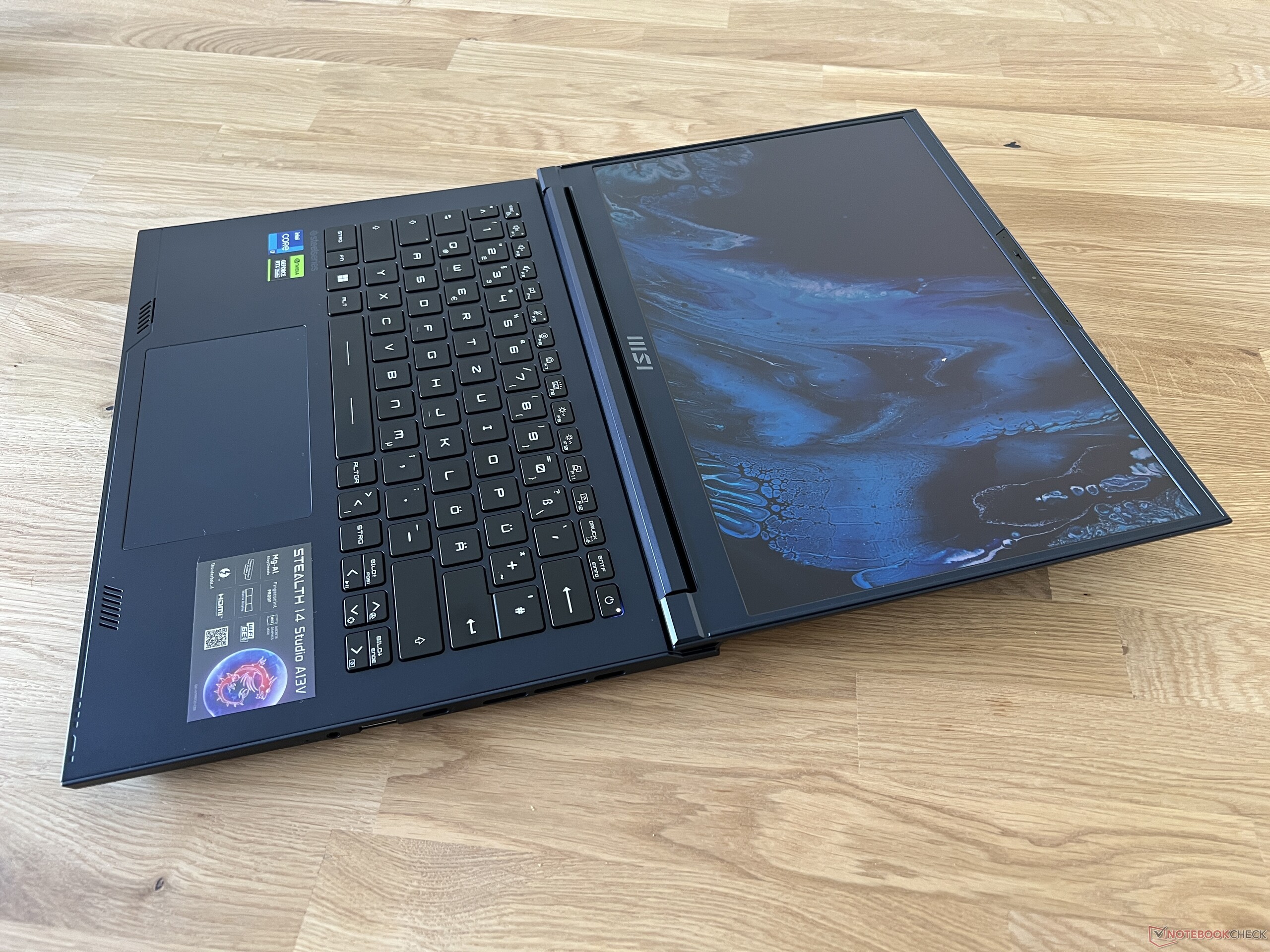 MSI ofrece el Stealth 14 Studio en azul oscuro o blanco. Estamos probando el modelo azul que parece bastante elegante pero tiene tendencia a mostrar bastantes marcas de huellas dactilares. Para un portátil de juegos, este diseño es en realidad bastante reservado - el logo del dragón en la tapa es lo único que llama la atención de la serie del dispositivo. En la parte trasera, hay algunos elementos de iluminación adicionales (que puedes activar a través del MSI Center) - ambas esquinas, así como el logo Stealth, pueden iluminarse. Por desgracia, no se puede cambiar el color o la intensidad de la iluminación.