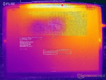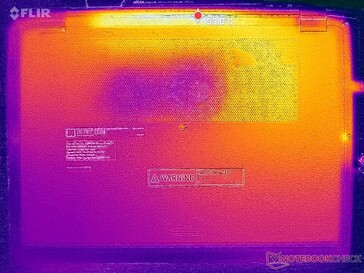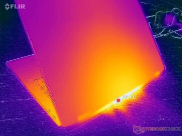 Los puntos calientes pueden ser muy cálidos a lo largo de la parte trasera a más de 45 C cuando se ejecutan cargas exigentes. Sin embargo, la temperatura media de la superficie es más fría que en el modelo 2022 ya que nuestra unidad AMD carece de GPU dedicada. Esto es evidente, ya que la mitad derecha de nuestro modelo 2024 sería mucho más fría que la mitad derecha del modelo 2022, que es donde estaría situada la dGPU.