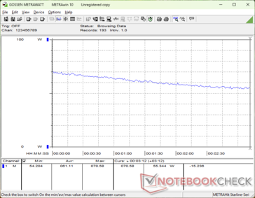 Nuestro sistema AMD es menos exigente que el modelo Intel-Nvidia 2022 en varios vatios cuando está en reposo en el escritorio, lo que contribuye a que la duración de la batería sea generalmente mayor, como se registra en la siguiente sección. El consumo puede ser unos pocos vatios superior cuando se ejecuta el estrés Prime95, pero esto se ve compensado por el rendimiento más rápido del procesador, por lo que el rendimiento por vatio sigue estando a favor de nuestra unidad alimentada por AMD.