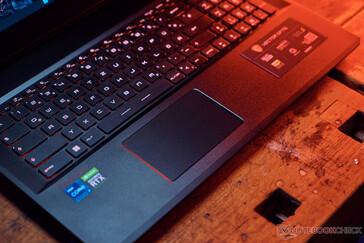 La tapa se puede abrir con una mano, aunque el ángulo máximo de apertura de 140 grados es un poco pequeño. El teclado está bien integrado en la carcasa y no se dobla en absoluto. Las superficies son ligeramente rugosas y tienen un tacto de alta calidad. Algunos bordes son un poco afilados debido al diseño para juegos, pero siguen siendo aceptables. Sin embargo, como el borde frontal de la carcasa está conectado al panel inferior, éste puede aflojarse o desprenderse un poco con el tiempo, lo que estropea la impresión general de calidad.