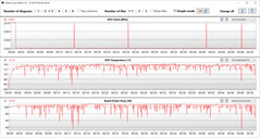 La prueba de estrés (Prime95 y Furmark en funcionamiento continuo) representa un escenario extremo para probar la estabilidad del sistema a plena carga. La CPU comienza la prueba a altas velocidades de reloj (P: 4 GHz, E: 3,3 GHz), mientras que la GPU arranca a 1,5 o 2 GHz. En los primeros 5 minutos, el reloj de la CPU desciende gradualmente hasta 2 o 2,4 GHz (núcleos P) y 1,9 o 2,1 GHz (núcleos E). Al mismo tiempo, el reloj de la GPU aumenta de 2,3 a 2,4 GHz.
