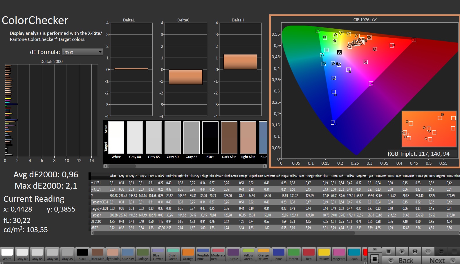 La pantalla muestra una buena reproducción del color ya en el estado de entrega, y con una desviación de aproximadamente 2,65, se cumple el objetivo de DeltaE < 3. Una calibración adicional reduce la desviación a 0,96 y garantiza una escala de grises más equilibrada.