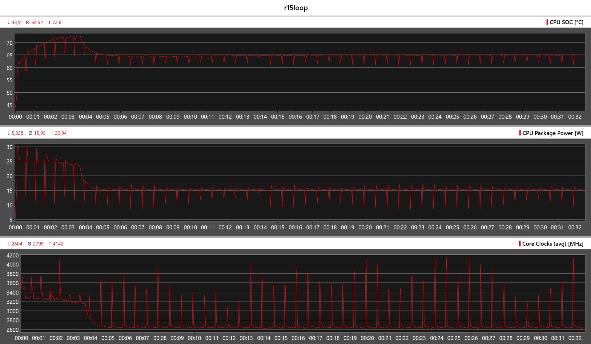 La ejecución de Cinebench R15 en bucle nos dio una idea de la eficiencia del sistema de refrigeración. Vimos una caída del rendimiento de aproximadamente el 10% después de la primera ejecución. Con una puntuación media de 1.099, el Minisforum Mars Series MC560 queda ligeramente por detrás del Ace Magician AMR5.