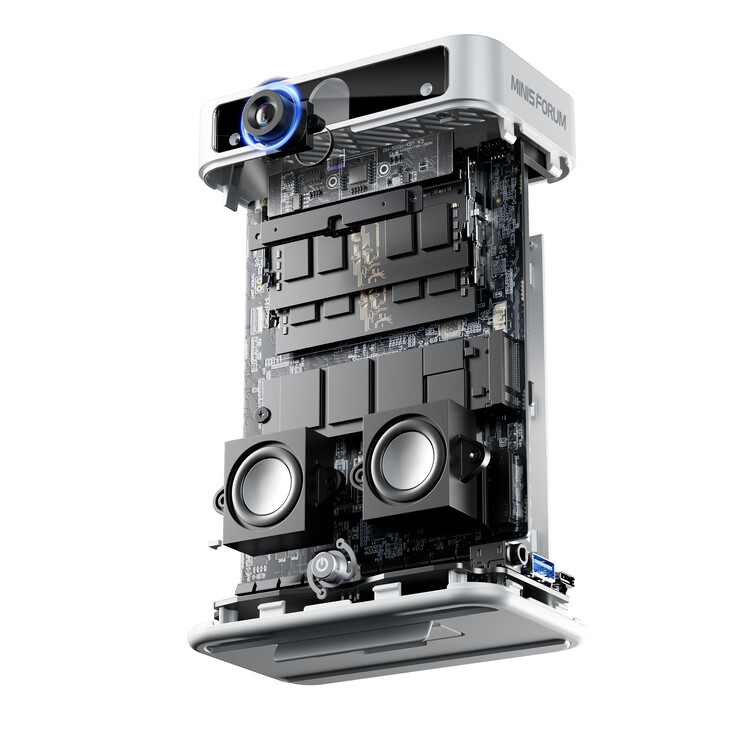 Minisforum desaconseja expresamente a los usuarios cualquier tarea de mantenimiento que requiera abrir el dispositivo. El motivo es la cámara integrada. El MC560 se monta en una sala limpia para evitar que entren partículas de polvo en el interior del dispositivo y afecten negativamente a la calidad de imagen de la cámara. Por este motivo, la empresa ha decidido no ofrecer la máquina como kit básico. Teniendo en cuenta todas estas razones, hemos decidido no abrir nuestra unidad de muestra para este análisis. No obstante, la siguiente imagen le permitirá echar un vistazo al interior de la Minisforum Mars Series MC560.