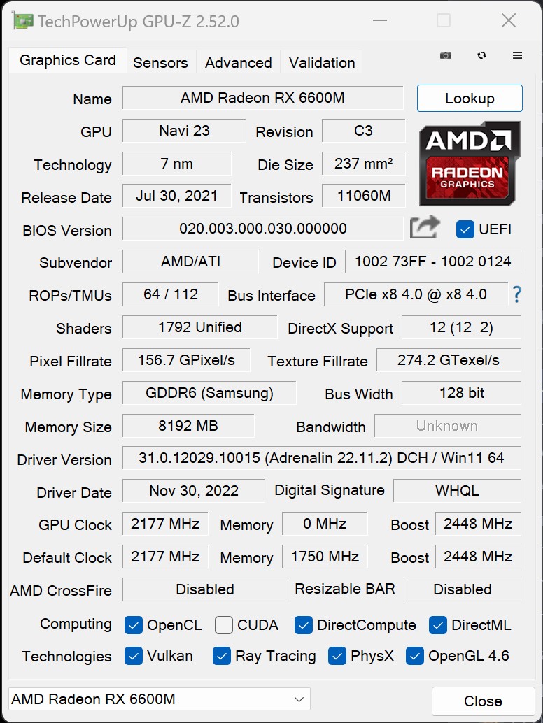 Para más detalles sobre la AMD Radeon RX 6600M, te remitimos a nuestra página de GPU.