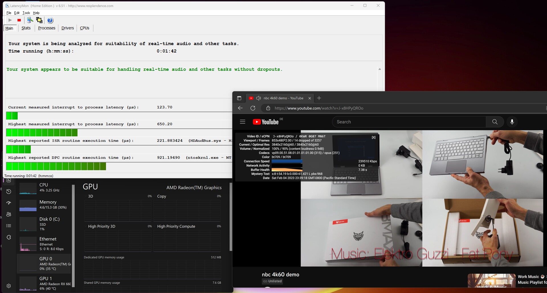 El Minisforum HX99G no tiene problemas al abrir varias pestañas del navegador en Edge y reproducir nuestros vídeos 4K de YouTube. LatencyMon no informa de latencias aumentadas en ese momento. Con sólo un 6%, laAMD Radeon RX 6600Mno se ve realmente desafiada al reproducir el vídeo de prueba.