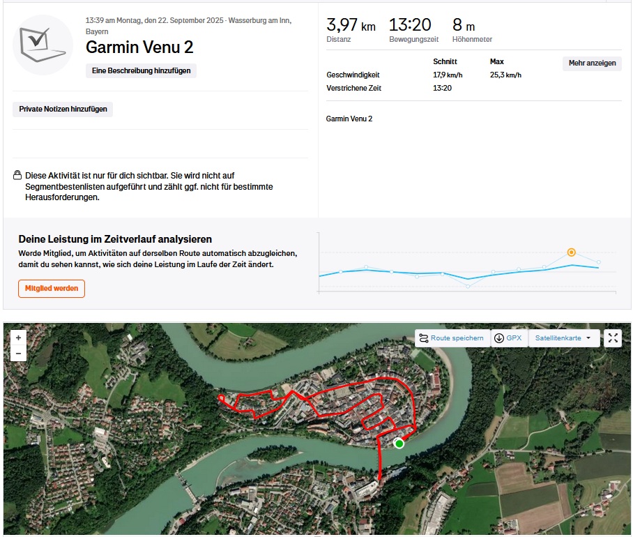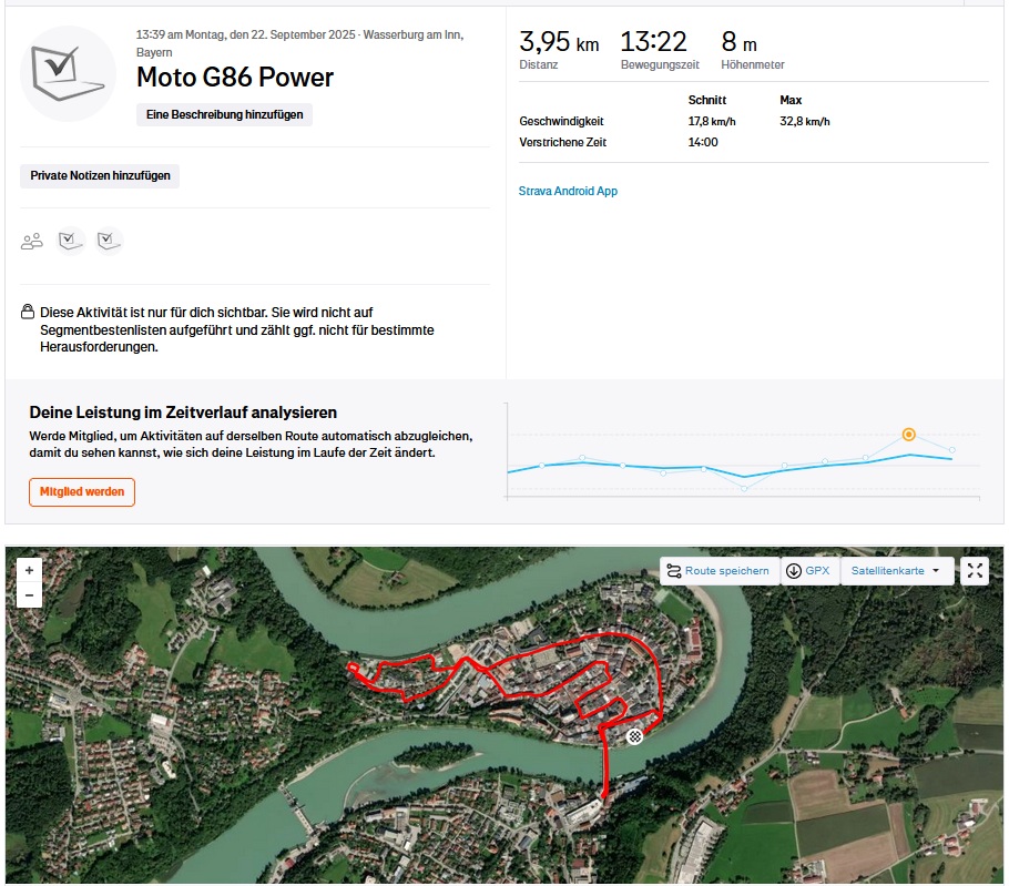 En exteriores, el Moto G86 Power fija rápidamente su posición con una precisión de unos tres metros. Durante nuestra prueba de ciclismo, la precisión de la ubicación se desvió ocasionalmente un poco, pero el smartphone sigue siendo lo bastante preciso para la navegación diaria.