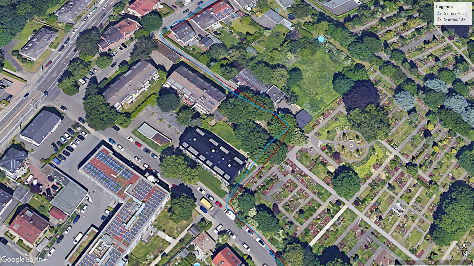 Durante nuestra prueba, el teléfono inteligente de OnePlus no mostró ninguna debilidad en lo que respecta a sus capacidades de localización. Un posicionamiento preciso tanto en exteriores como en interiores, la compatibilidad con GNSS dual y una buena consistencia de la ruta durante nuestra prueba práctica hablan a favor del 13R. Sin embargo, notamos algunas desviaciones menores en la distancia recorrida, especialmente al cambiar de dirección. Aun así, el Garmin Venu 2 utilizado a efectos comparativos ofreció un recorrido comparable en general, por lo que podemos recomendar el OnePlus 13R sin dudarlo incluso para tareas de navegación exigentes.